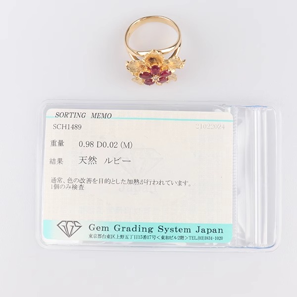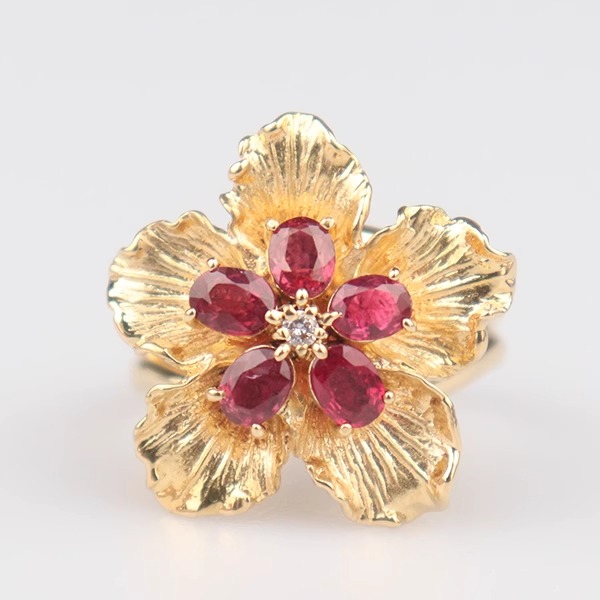 中古「95新」日本进口商品花形5颗红宝石钻石戒指K18黄金51号时尚