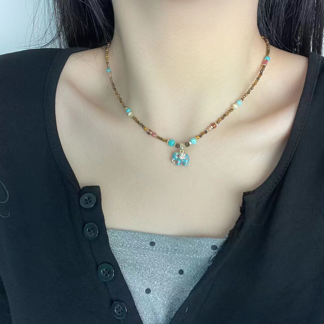 卡通萌趣蓝色小象吊坠串珠项链时尚高级感珍珠前后戴耳环优雅饰品