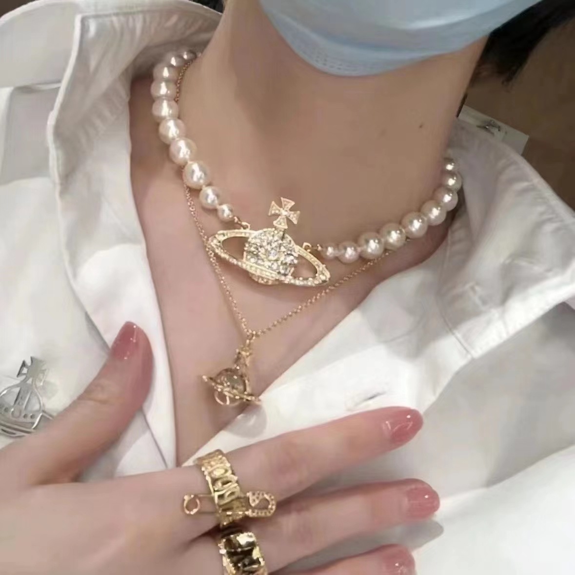 新款西太后薇薇单层珍珠满钻大土星项链女爆款高级感颈链项饰代发