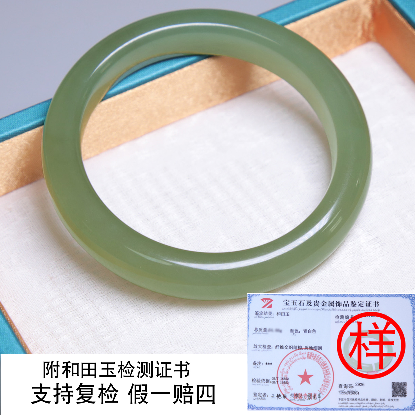 珪宝54.5mm和田玉青白玉宽条手镯女款玉石镯子天然带证书礼物YC60