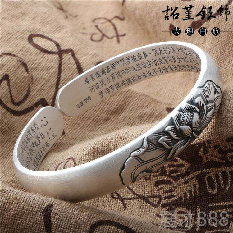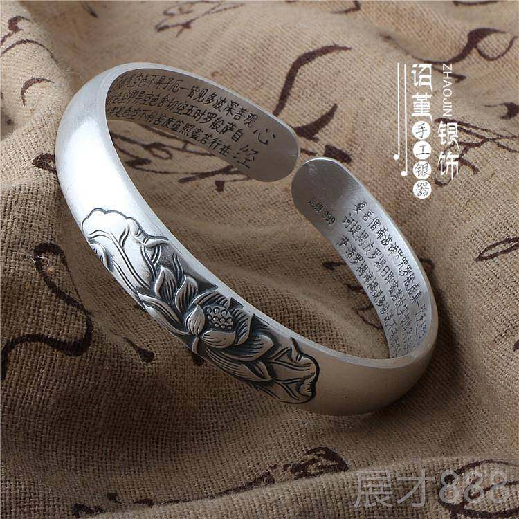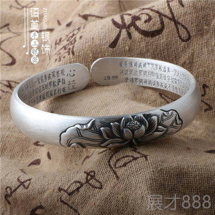 正品莲心经银花手镯9开99纯银民足银雪花银口复古族风银手镯镯子