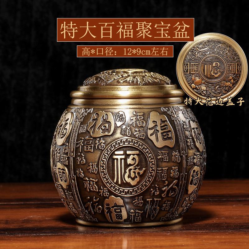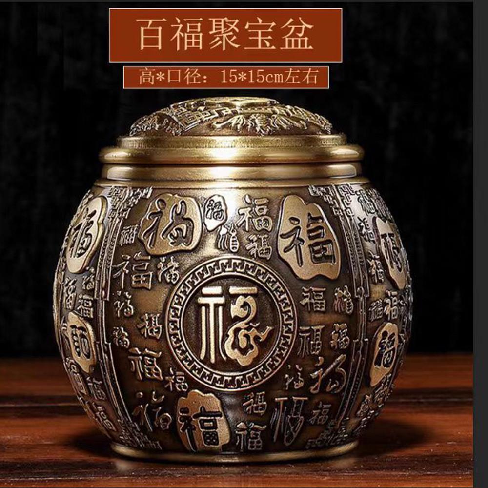 带盖百福聚宝盆茶叶罐黄铜米缸办公室小摆件书房装饰品开业礼品
