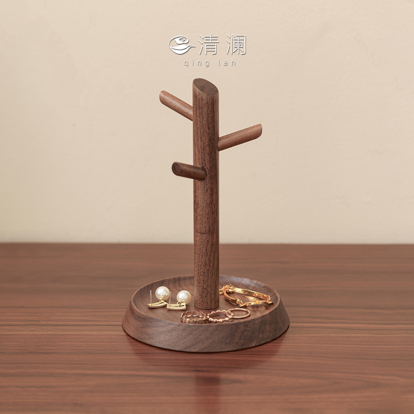 清澜胡桃木玄关收纳钥匙盘圆盘高端门口鞋柜桌面收纳架轻奢实木
