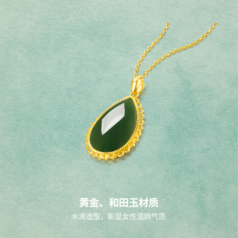 周六福和田玉吊坠妈妈金镶玉黄金足金水滴碧玉玉坠挂件节日礼物