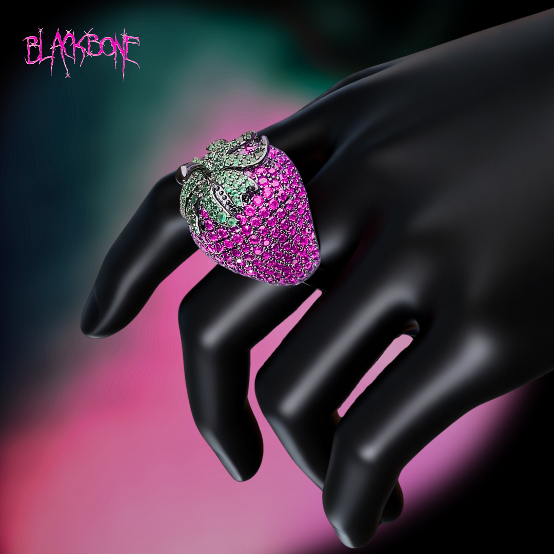 黑骨BLACKBONE邪恶草莓Evil Strawberry满钻戒指暗黑钛钢红刚玉