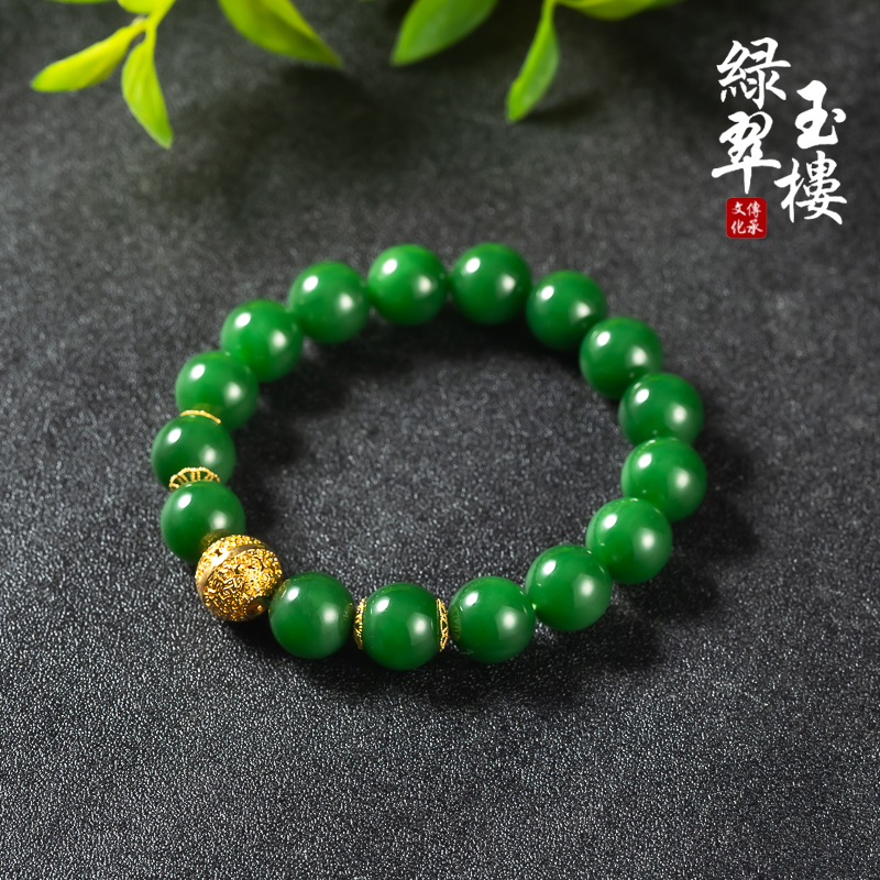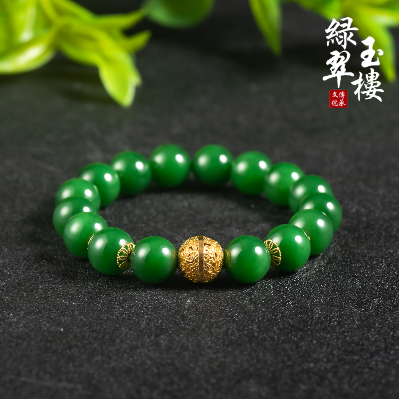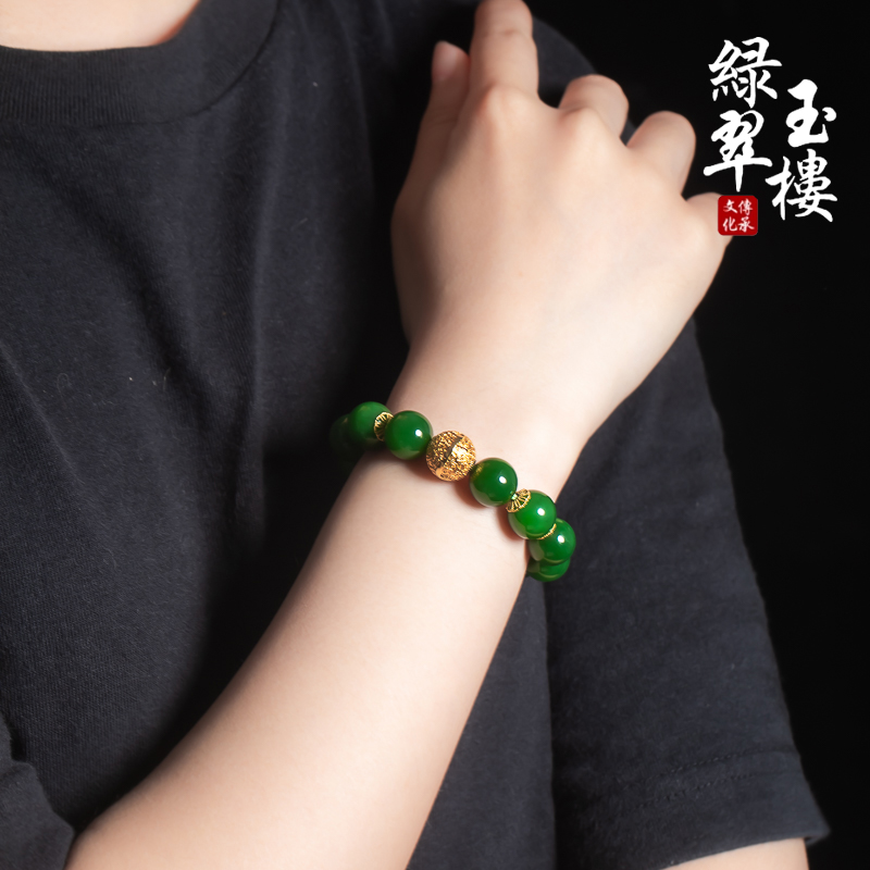 绿翠玉楼天然和田碧玉菠菜绿手串珠子手链18K金珠手饰珠宝玉石634
