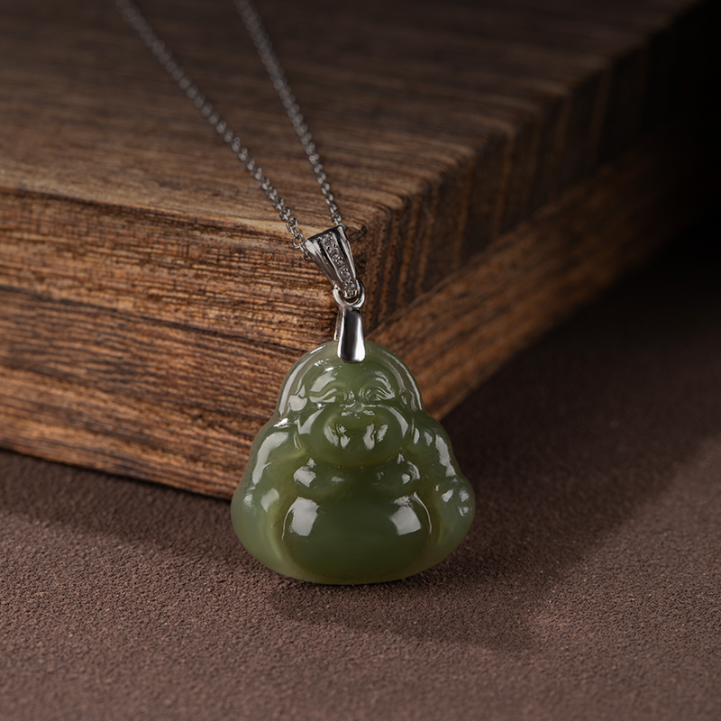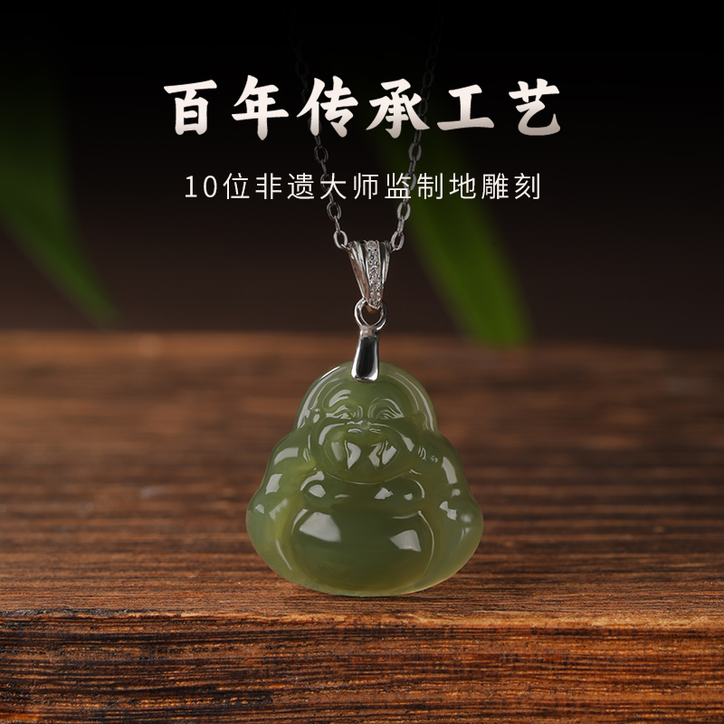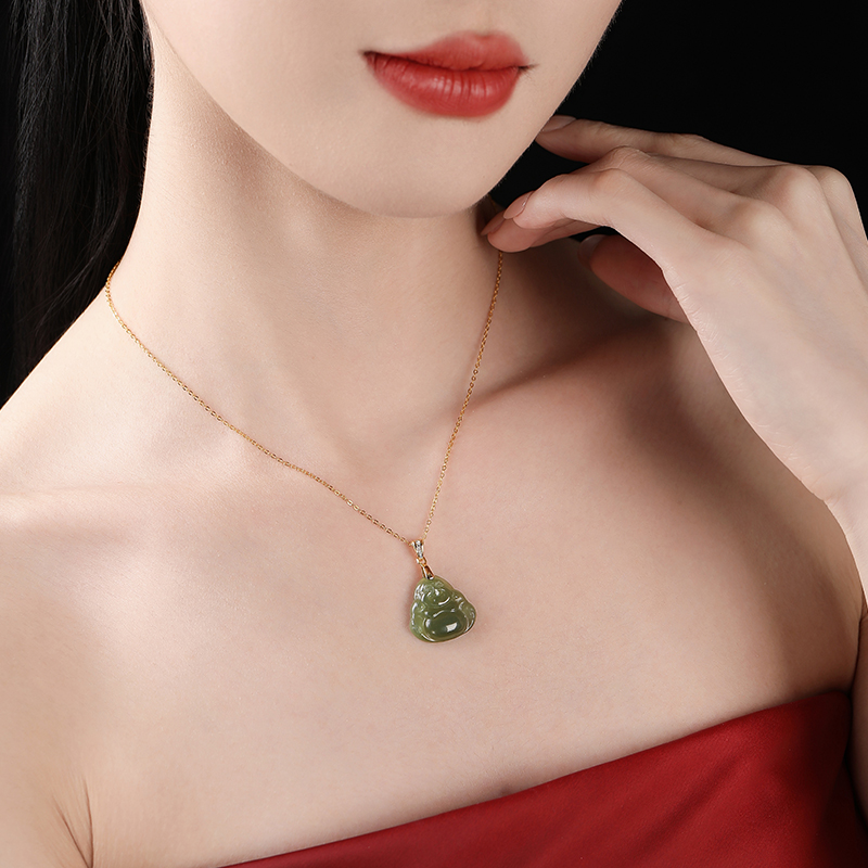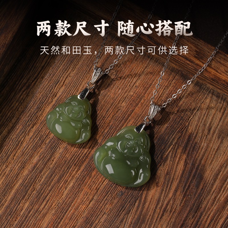 和田玉弥勒佛项链925纯银镀金锁骨链佛公小佛吊坠青玉翡翠绿佛女