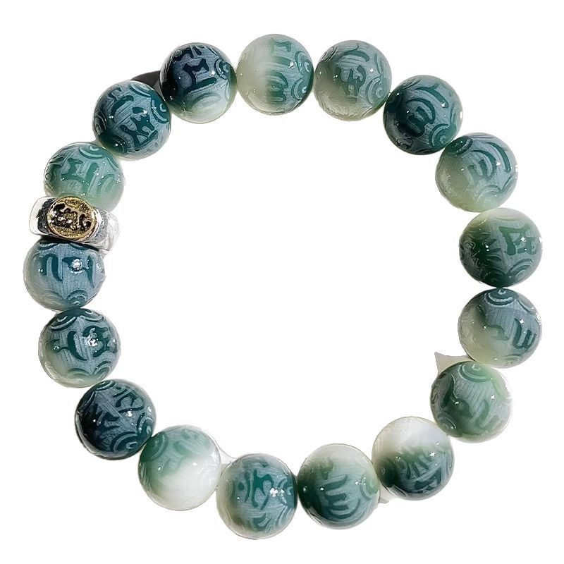 天然绿飘花雕刻六字真言菩提手串生肖本命文玩绕指柔佛珠念珠