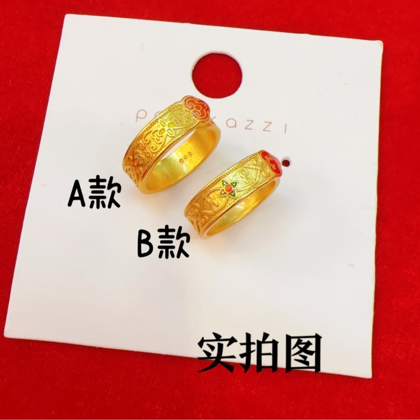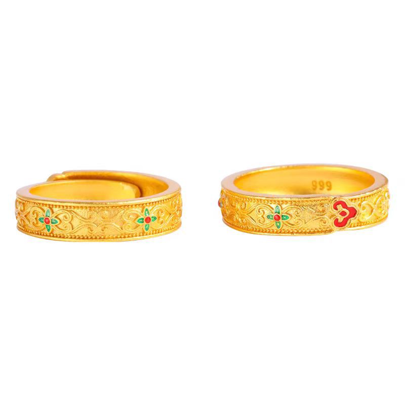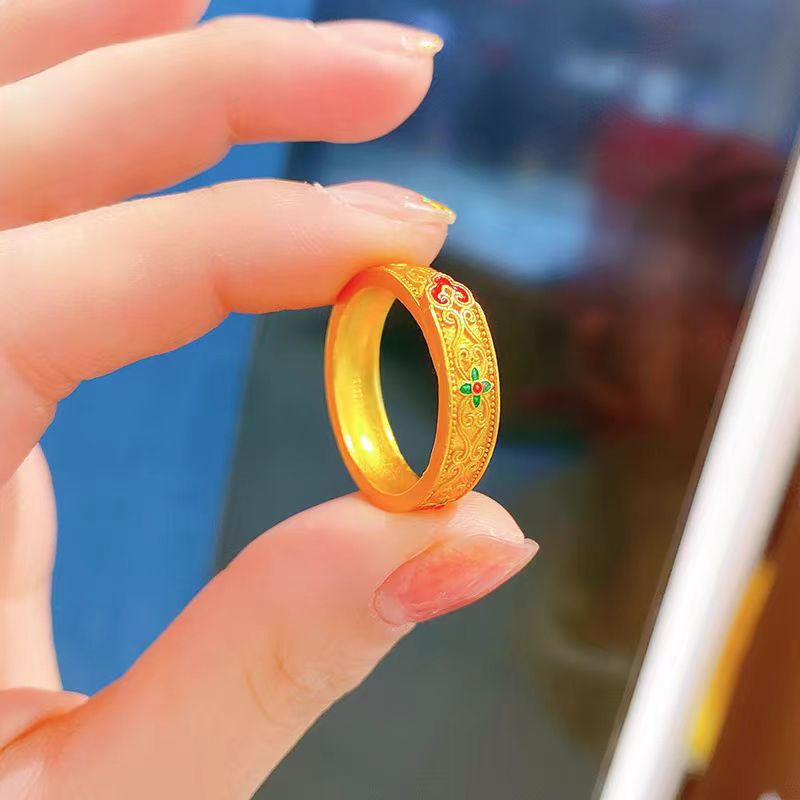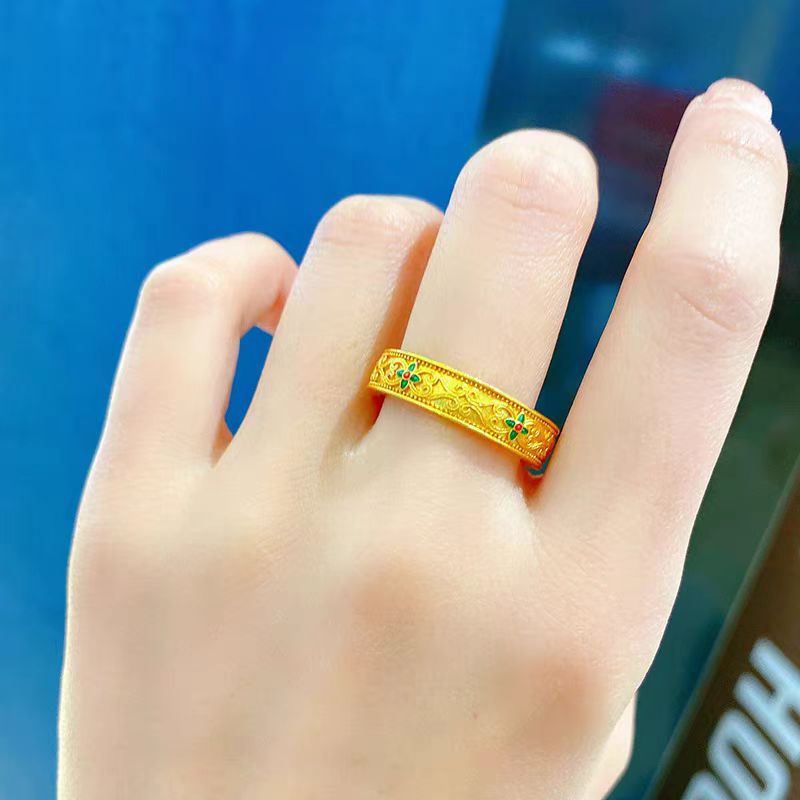国风古法黄金戒指宫廷复古风开口可调节祥云沙金戒情侣烧蓝女指环