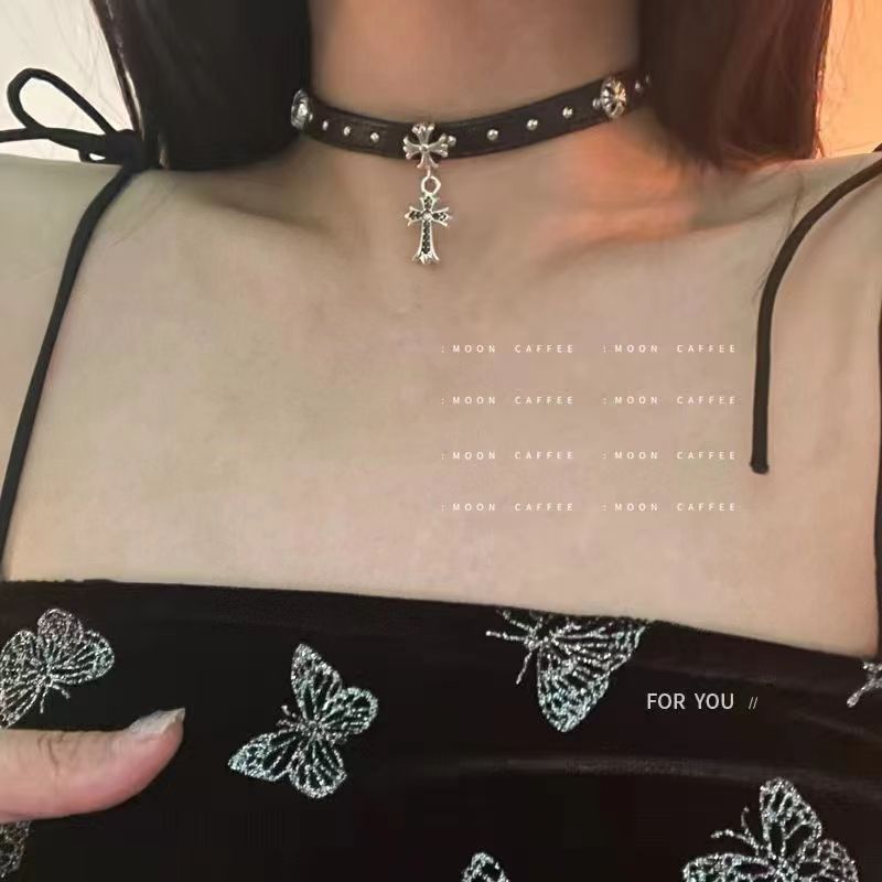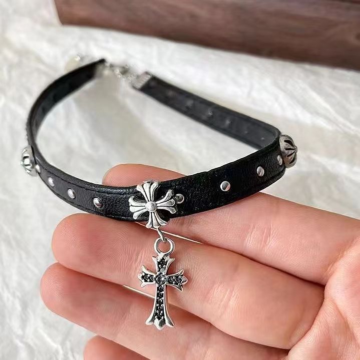 甜酷时髦暗黑锆石十字架项链皮绳皮质项圈女颈带短款锁骨链choker