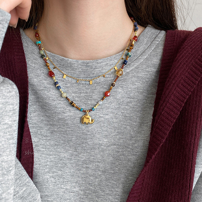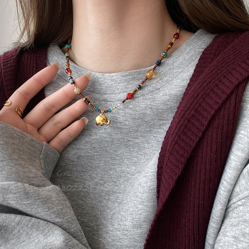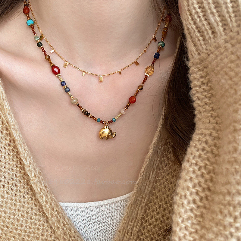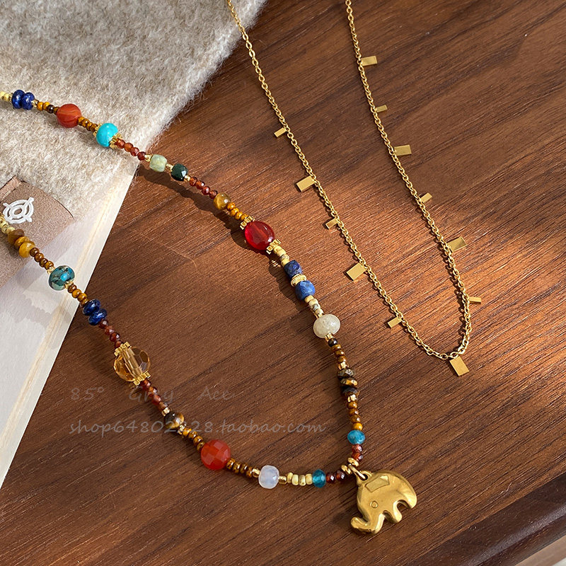 轻奢气质彩色天然石小象串珠项链女小众独特锁骨链时尚高级感颈链