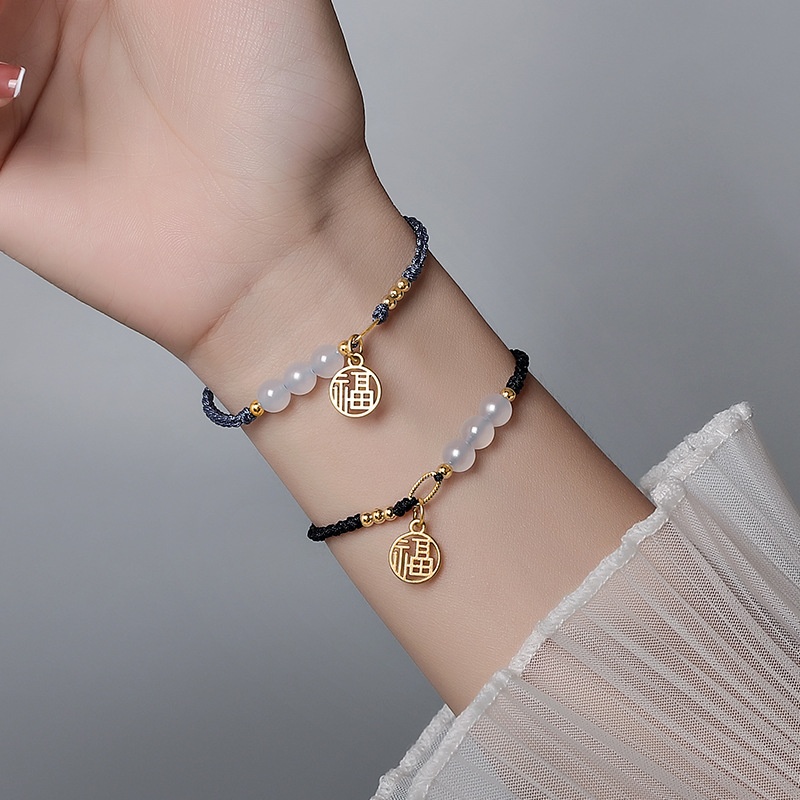 羊脂白玉手链小众设计钛钢保色福牌手绳编织绳闺蜜情侣款男女