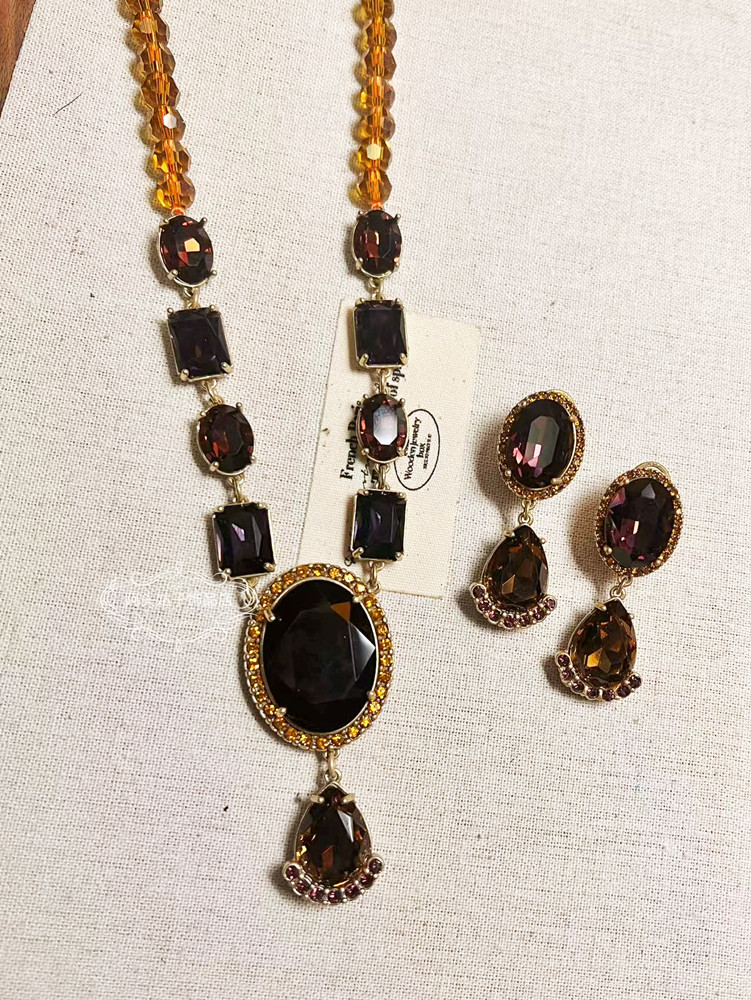 欧美宫廷风中古vintage复古气质黄水晶紫闪钻椭圆水滴项链耳环女