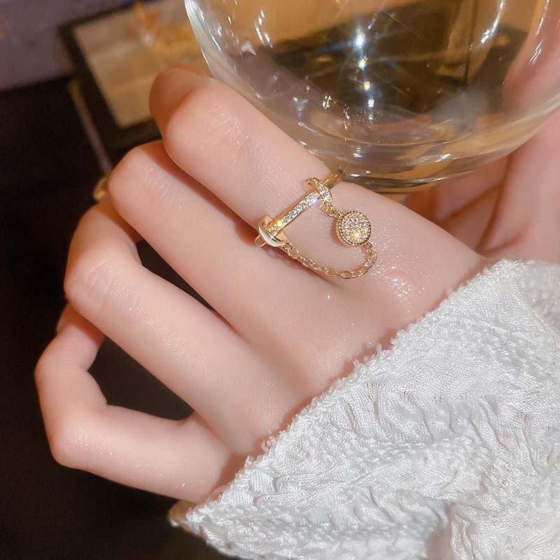 锆石镶钻圆形链条流苏镀真金戒指小众轻奢风高级感百搭开口食指戒