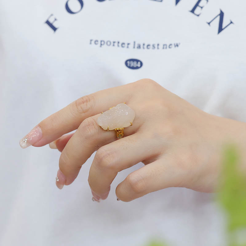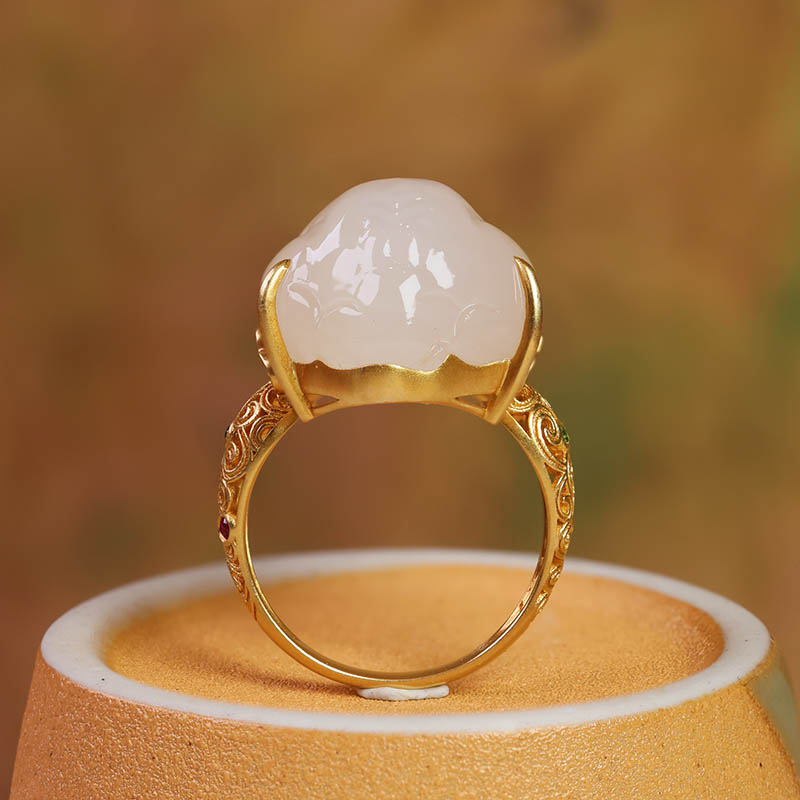 520情人节礼物天然和田玉戒指女藕粉白玉貔貅镶18k金手饰送老婆