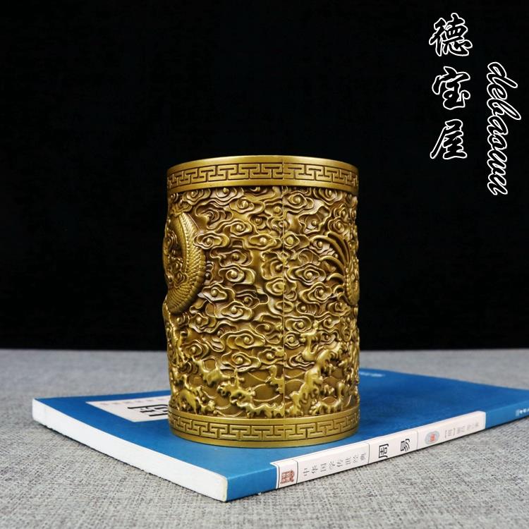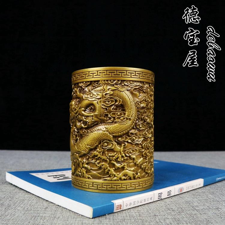 古玩铜器纯铜盘龙笔筒桌面摆件工艺品艺术品笔筒书房用品家居摆放