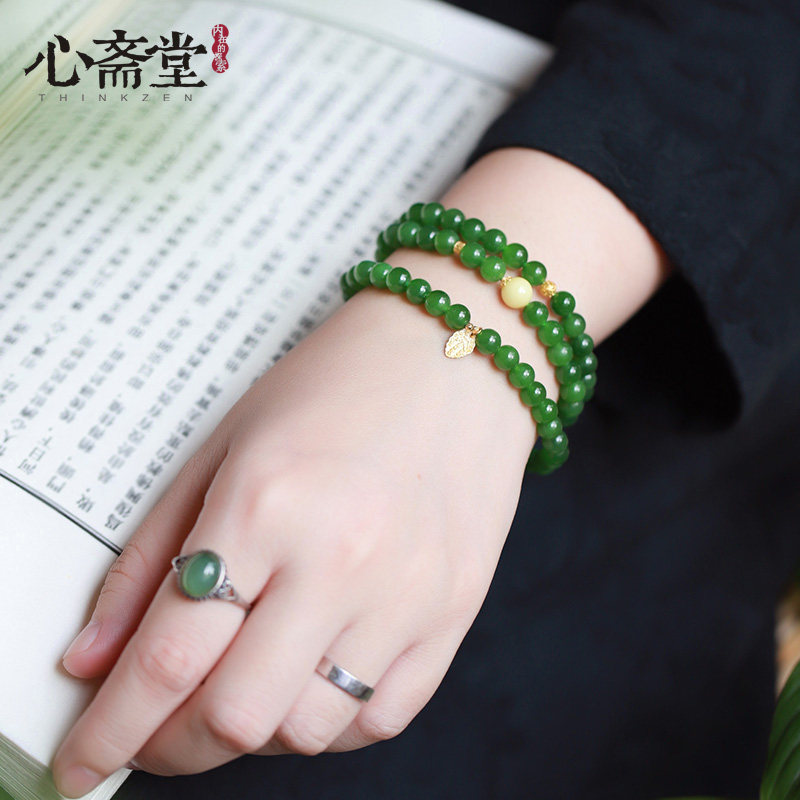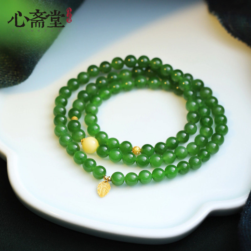 心斋堂【金叶】天然俄料冰底菠菜绿碧玉手串女收藏和田玉黄金手链