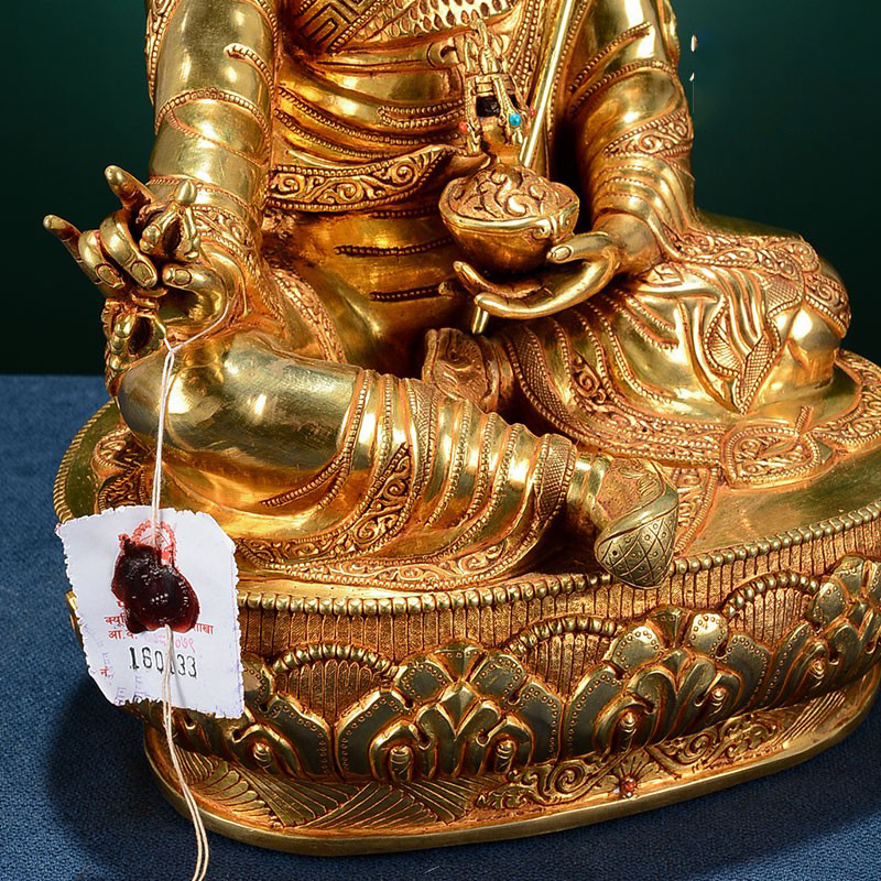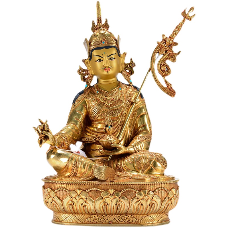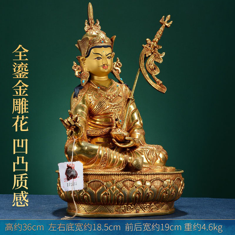 尼泊尔手工莲花生大士鎏金雕花居家桌面莲花生大师铜像10寸