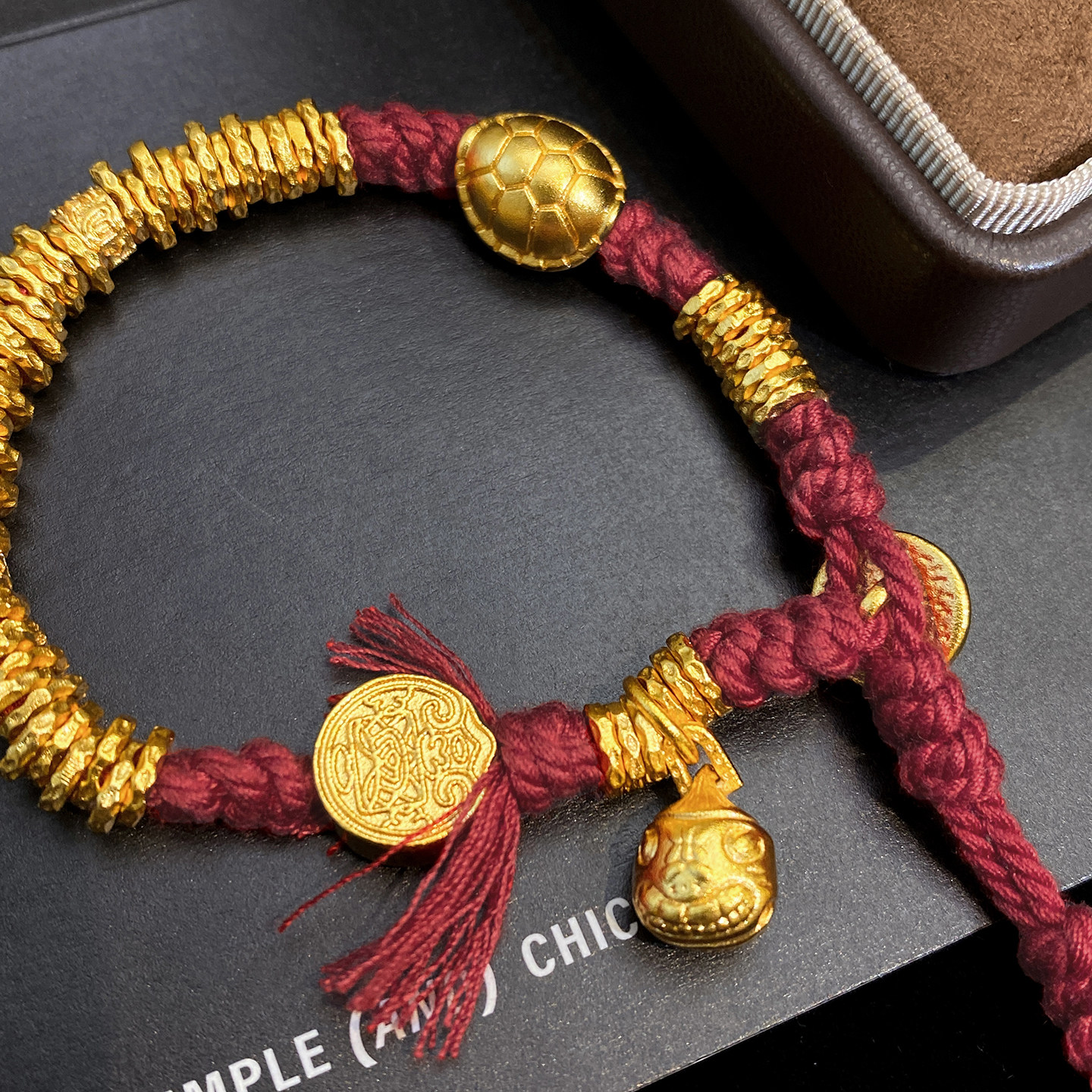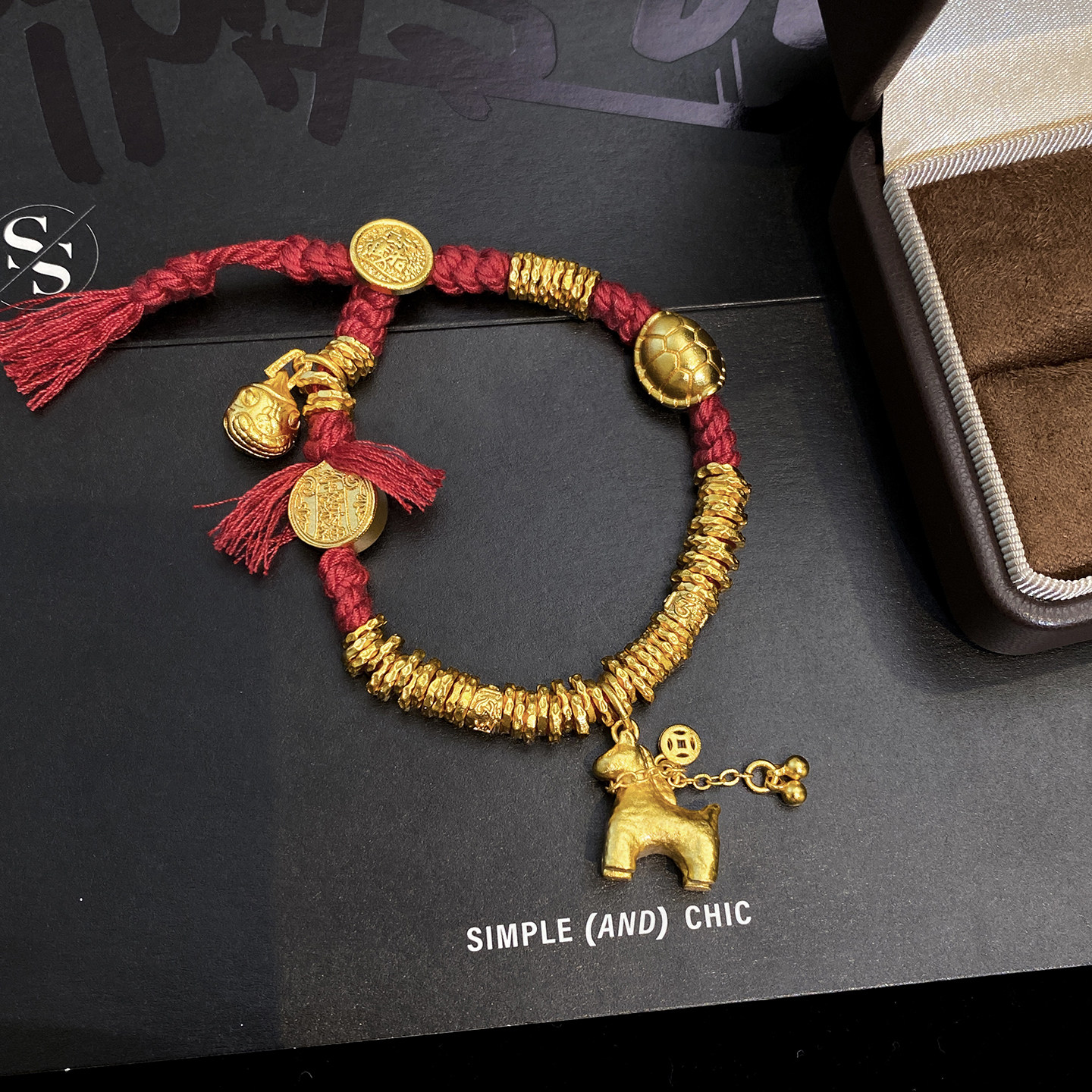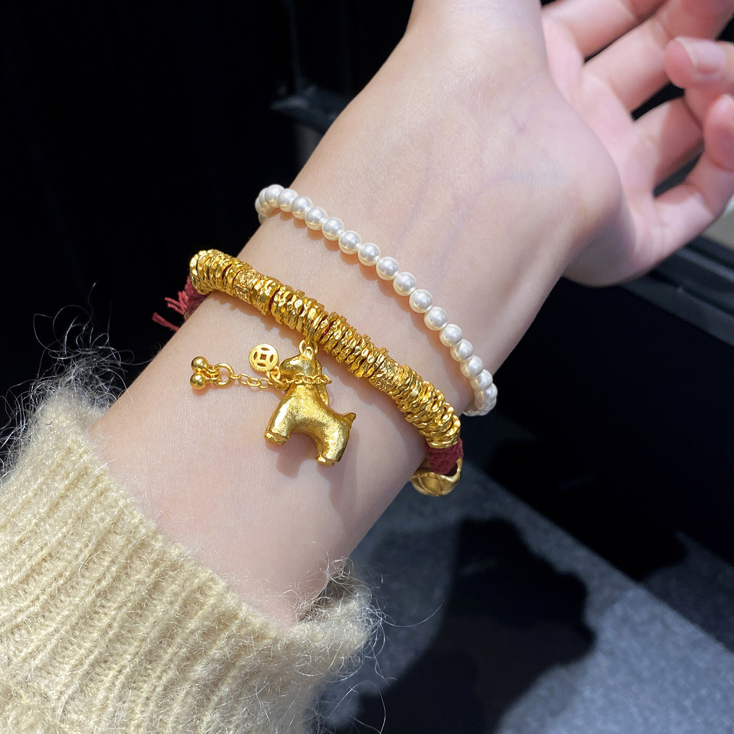 马上有钱黄金盘缠红色编织绳手链2026马年本命年24K古法沙金手饰