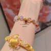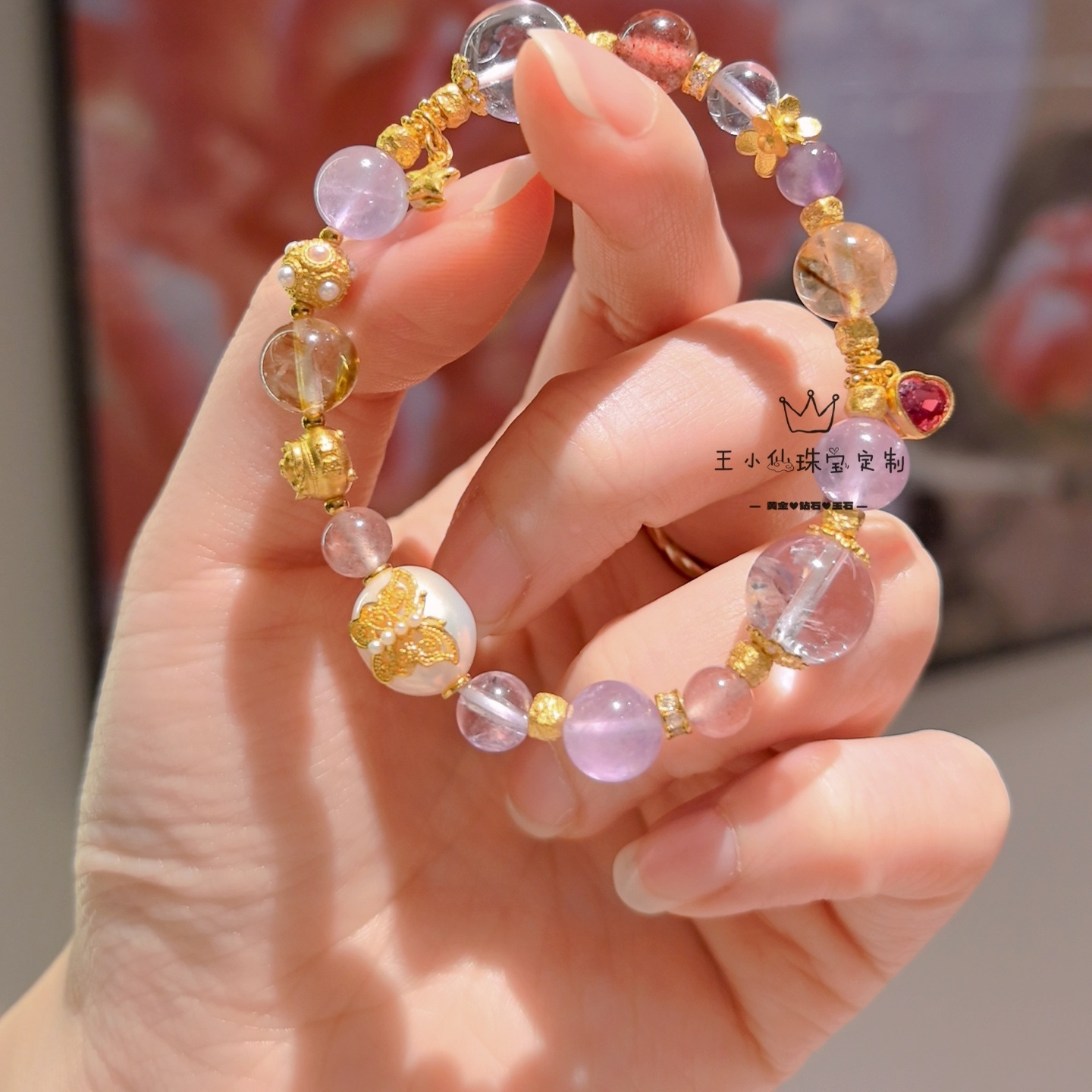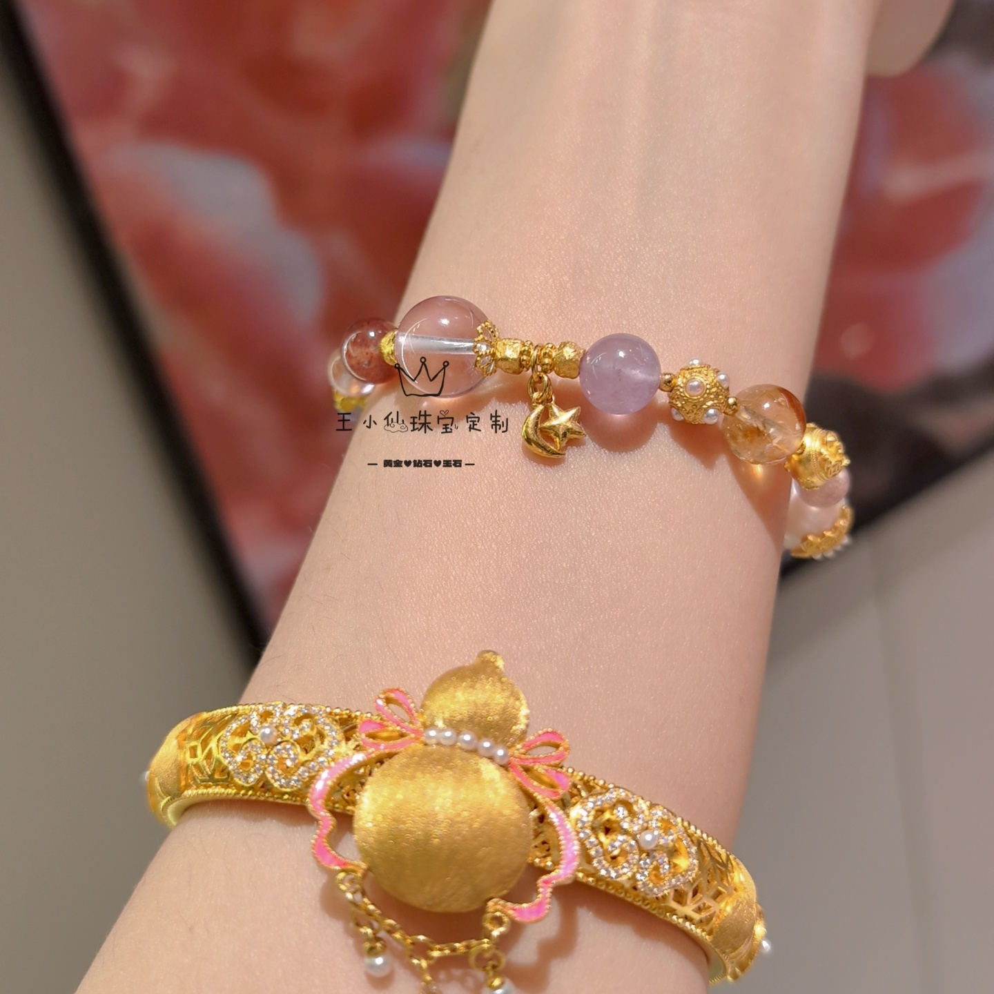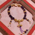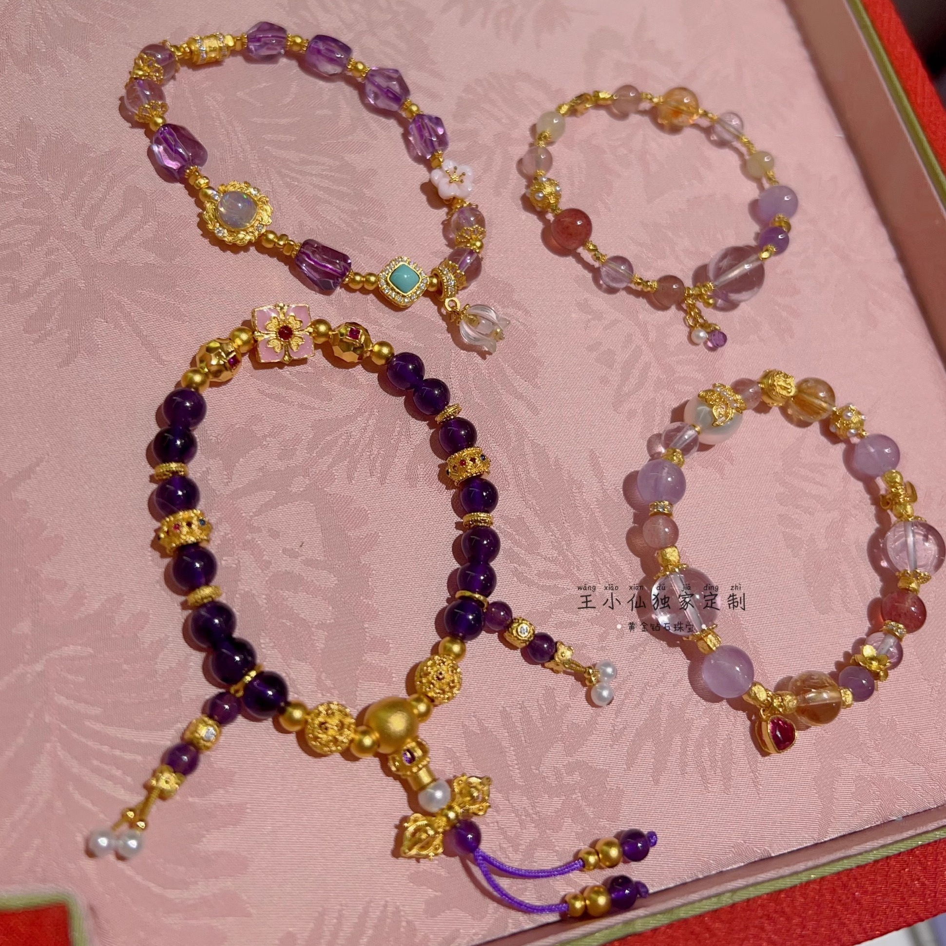 足金999古法金天然紫水晶招财聚宝盆花丝蝴蝶碧玺爱心弹力手串