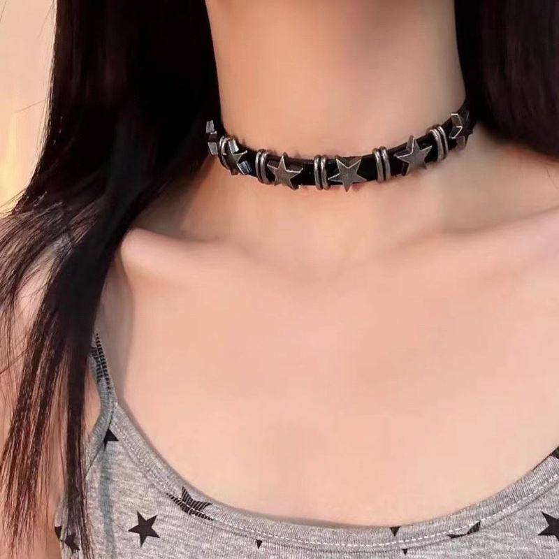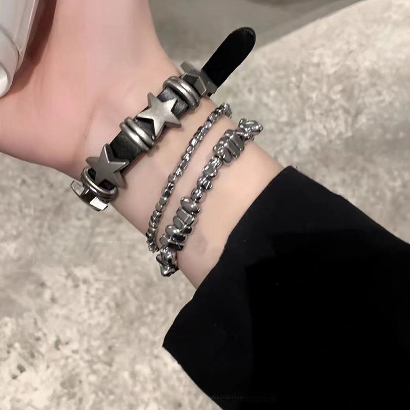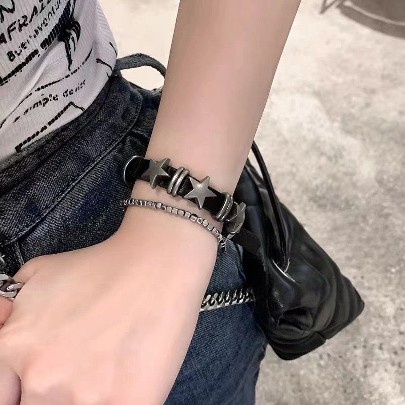 日本星星牛皮革黑色手链爆款复古情侣细手环朋克y2k暗黑摇滚辣妹