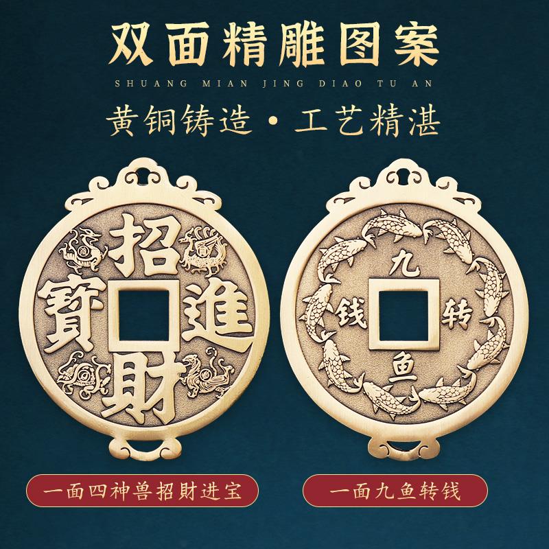 道家纯黄铜招财进宝大铜钱摆件四神兽入户玄关镇门对门家宅物挂件