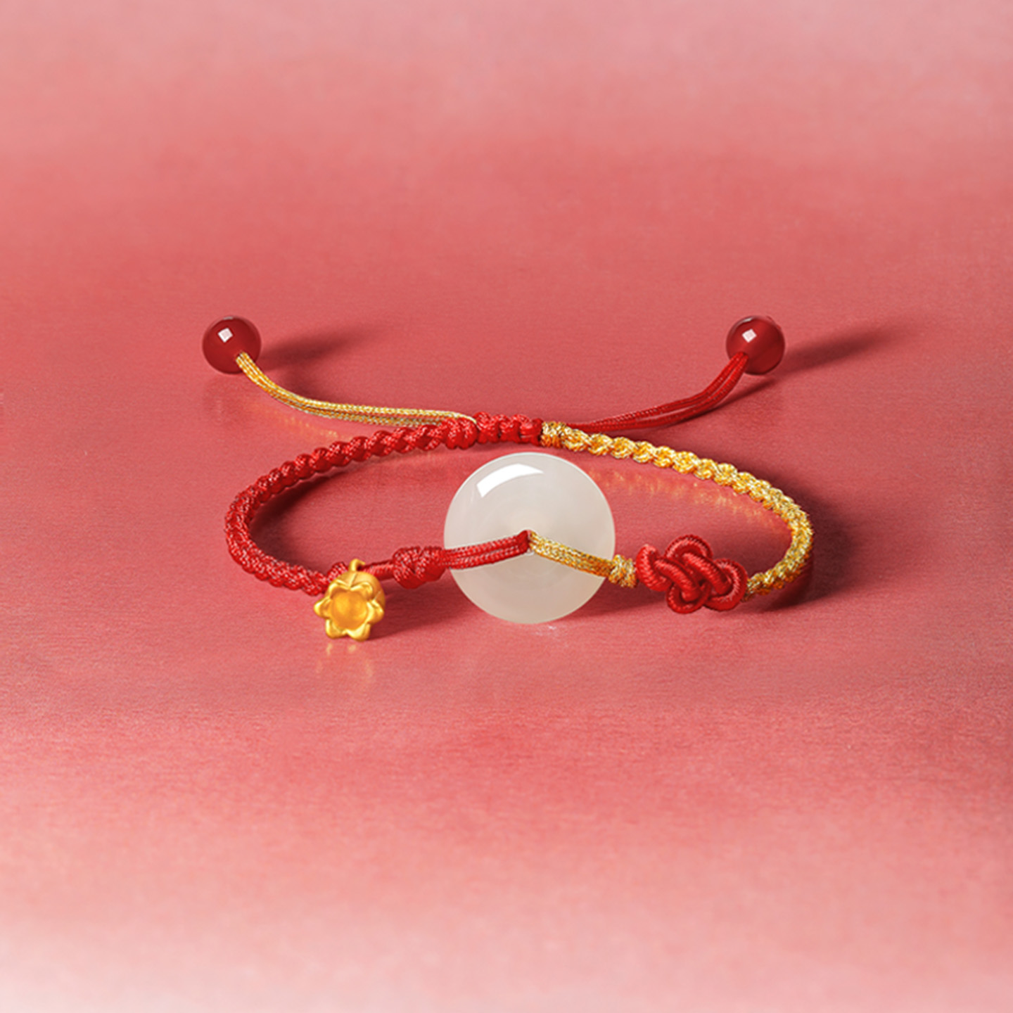 周六福和田玉手绳黄金足金平安扣手链女金镶玉红编绳节日礼物