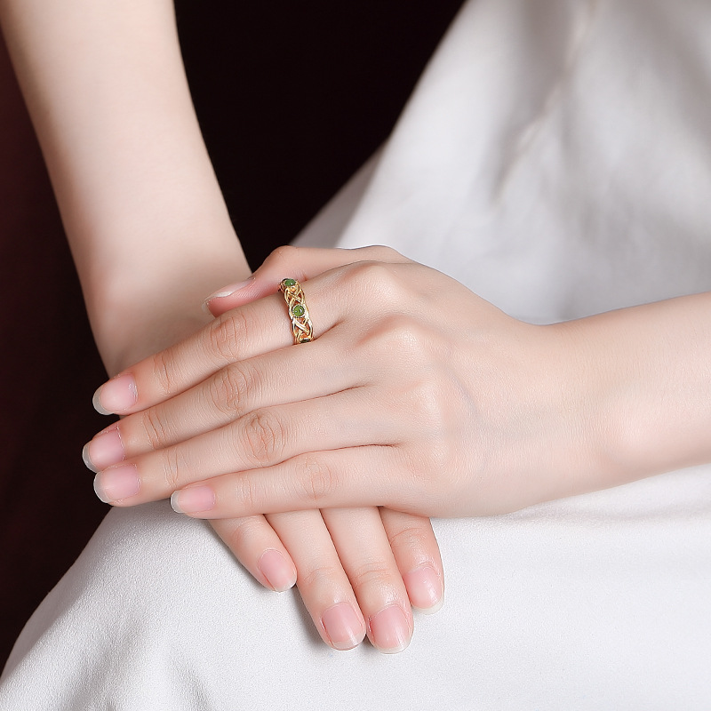 山予棠S925纯银镀金和田玉碧玉镂空花编戒指时尚个性圆形开口指环