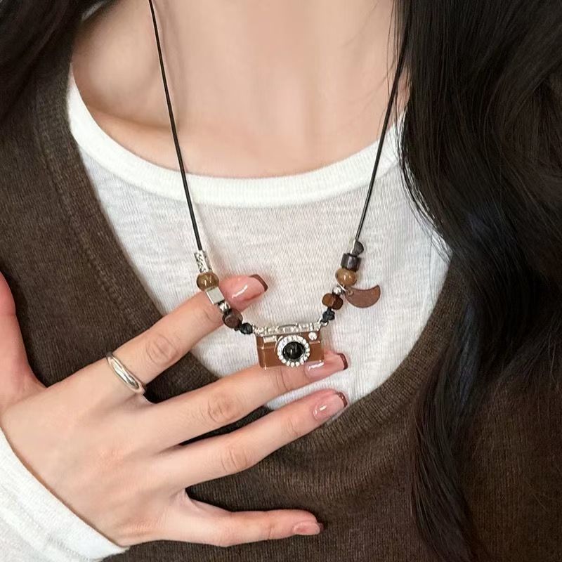 复古棕色胶片相机项链女秋冬高级设计感皮革虎眼石毛衣链百搭颈链