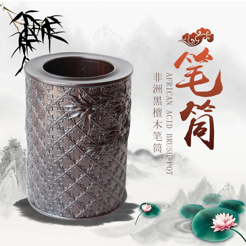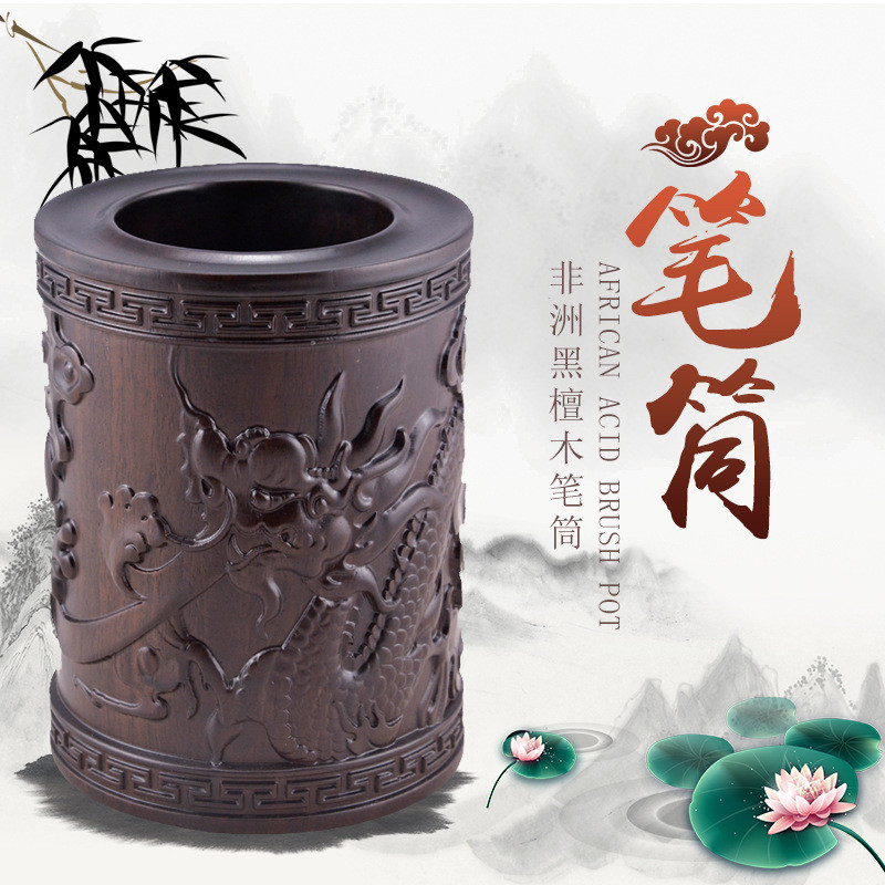 红木雕刻黑檀木浮雕笔筒荷花牡丹麒麟招财马到成功厂家定制批发