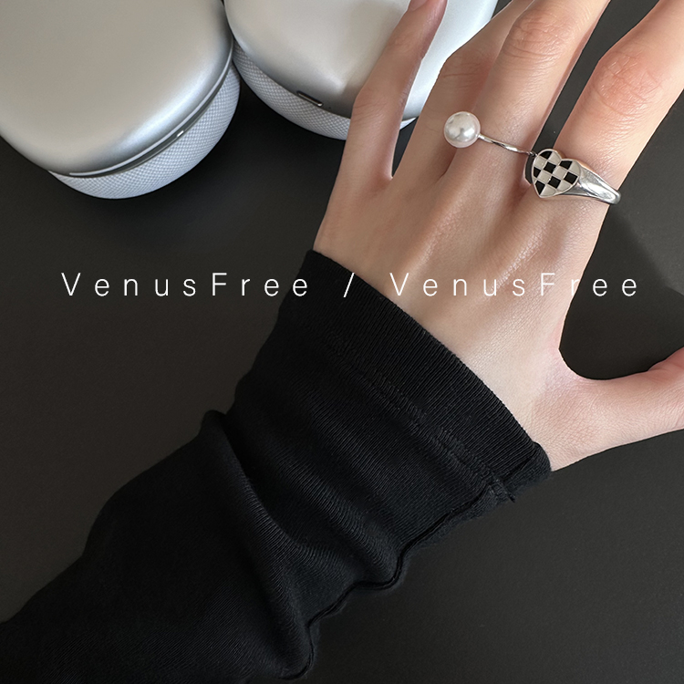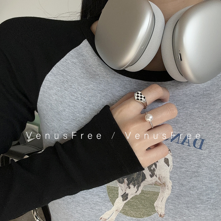 古灵精怪~925纯银大颗珍珠甜酷爱心棋盘格马赛克戒指环开口韩国