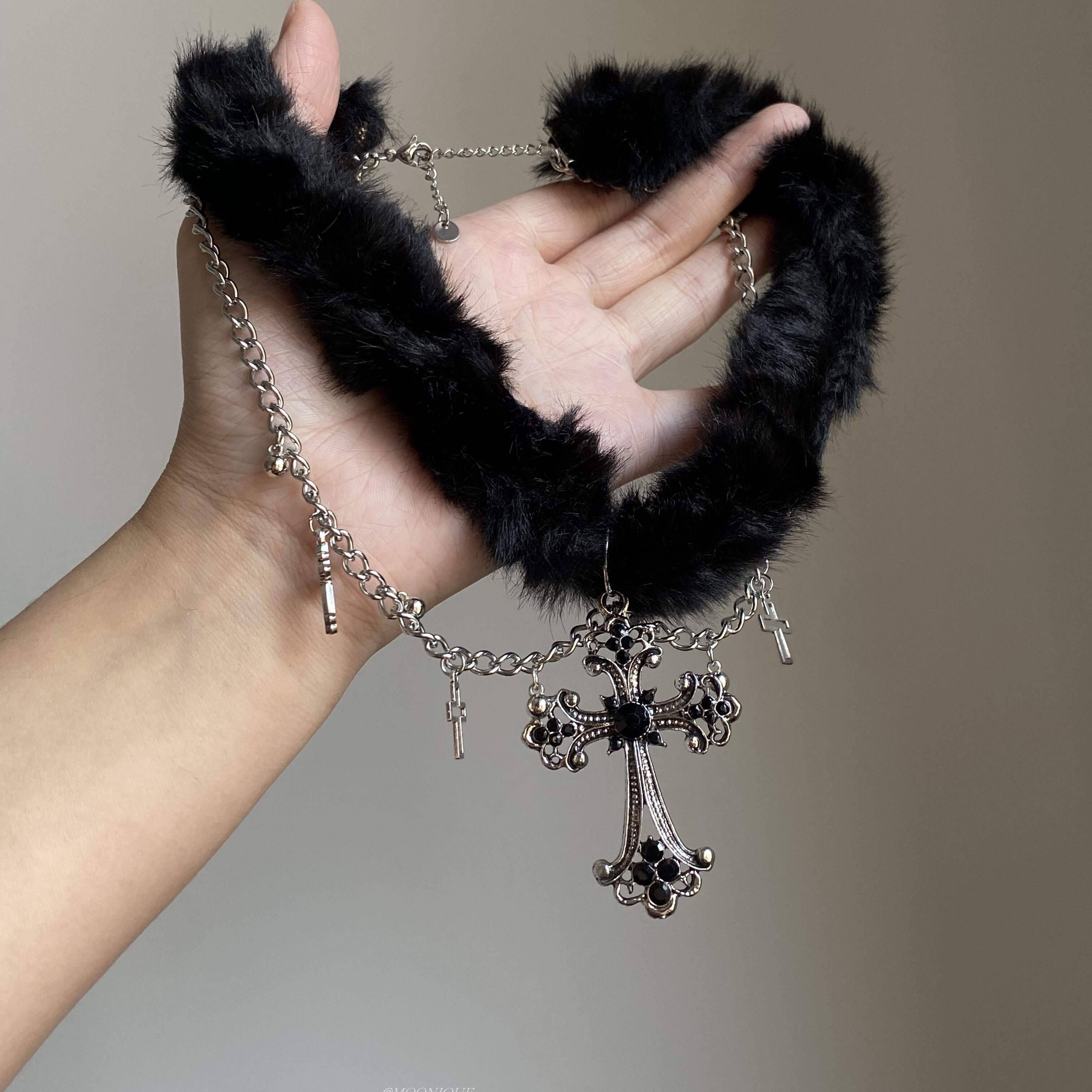 甜酷风黑色毛绒双层十字架项链女独特设计感精致choker叠戴锁骨链