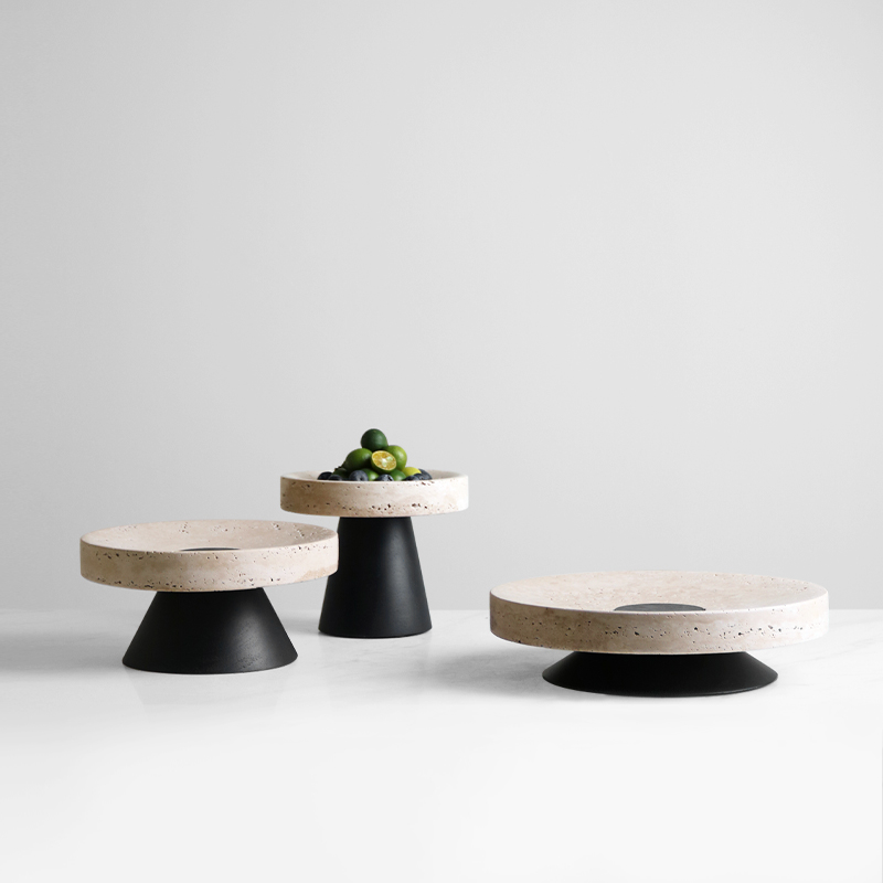 梵其侘寂风创意洞石圆形实木底托盘摆件简约客厅茶几餐.桌果盘装