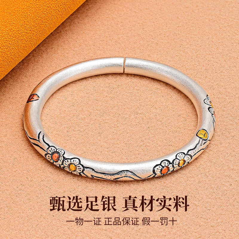 梅花银手镯女纯银999实心哑光手工錾刻闭口古法素圈手环女送妈妈