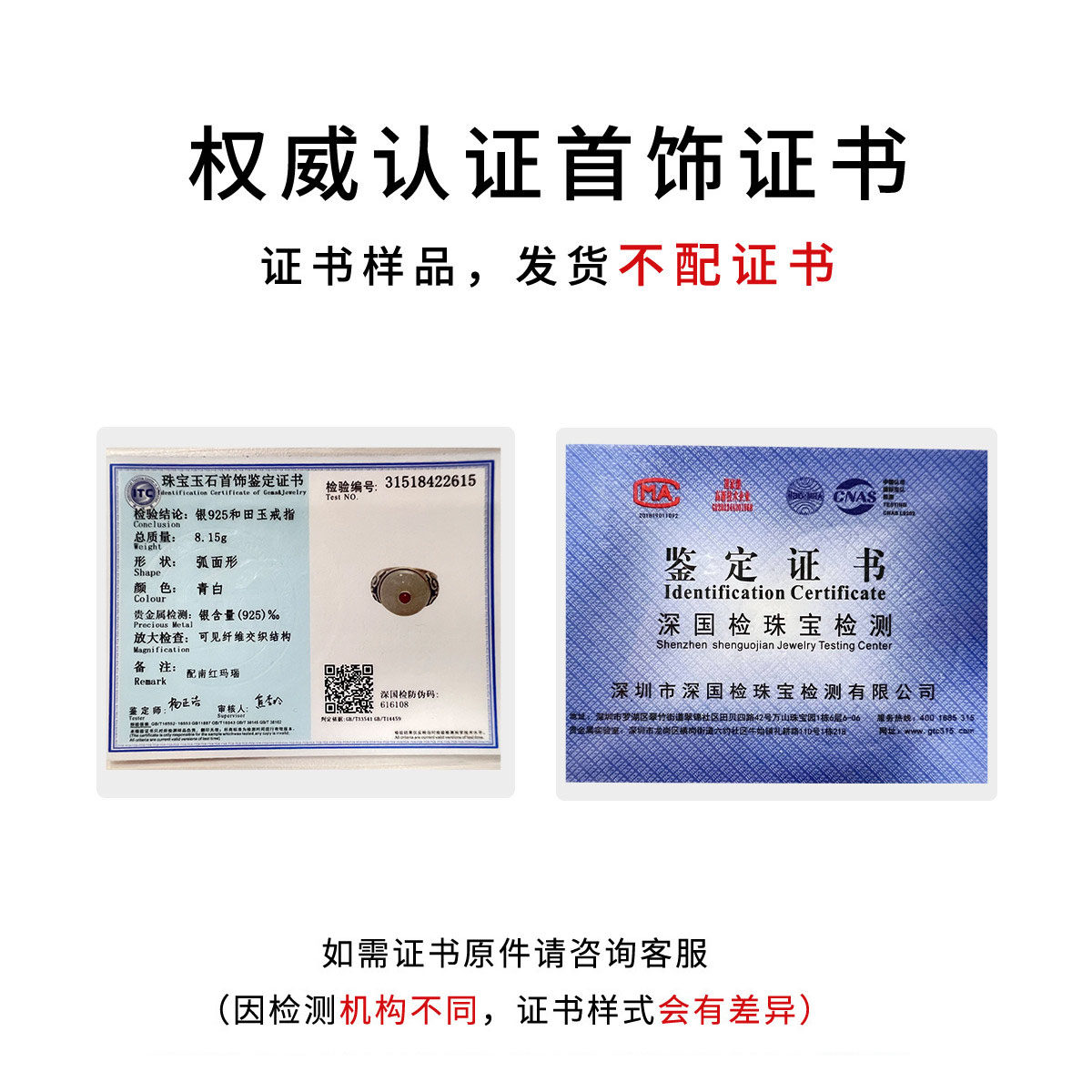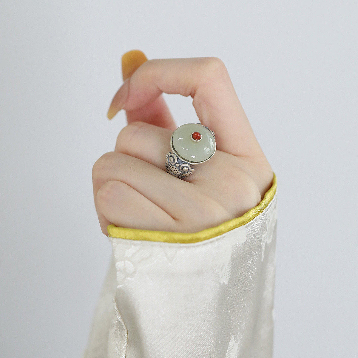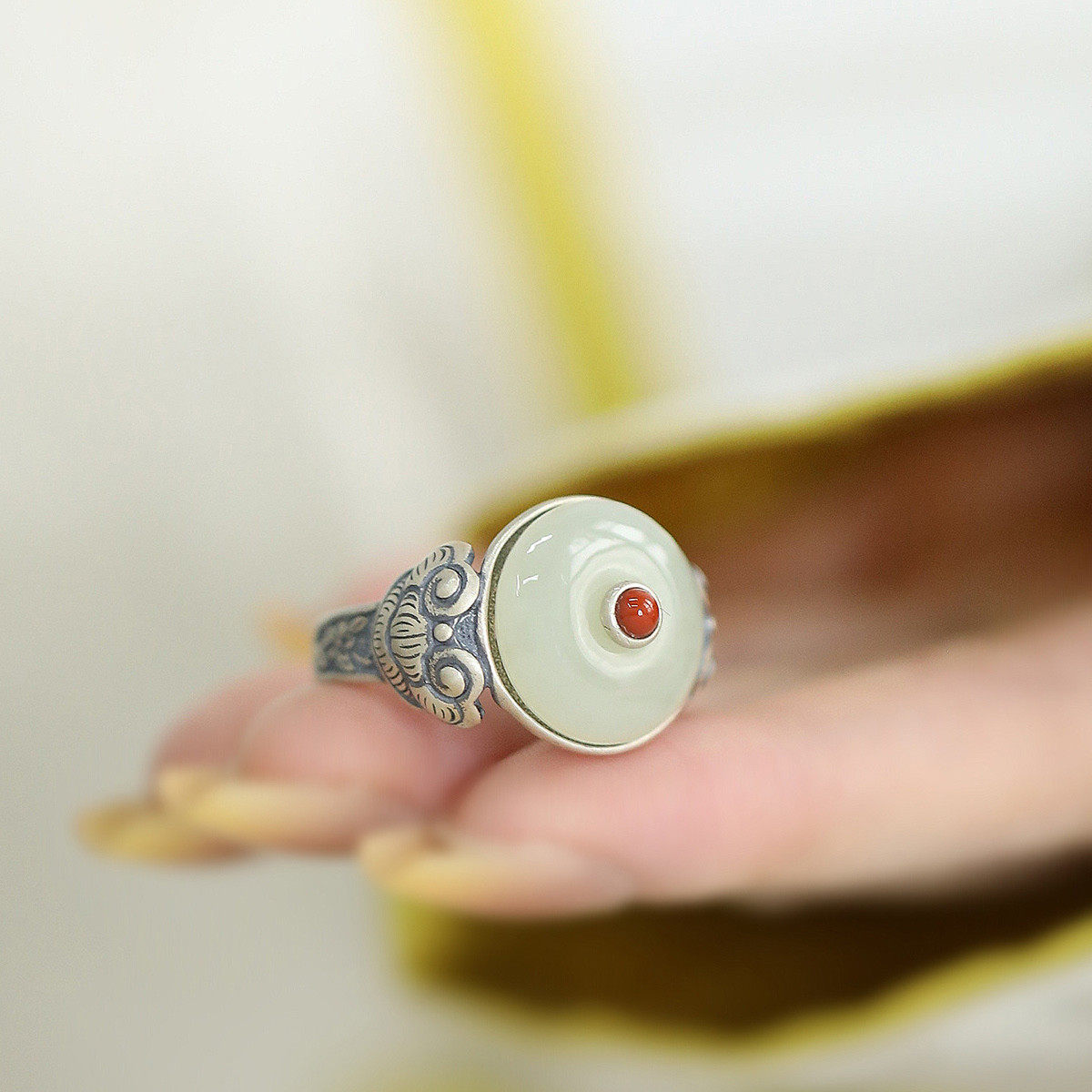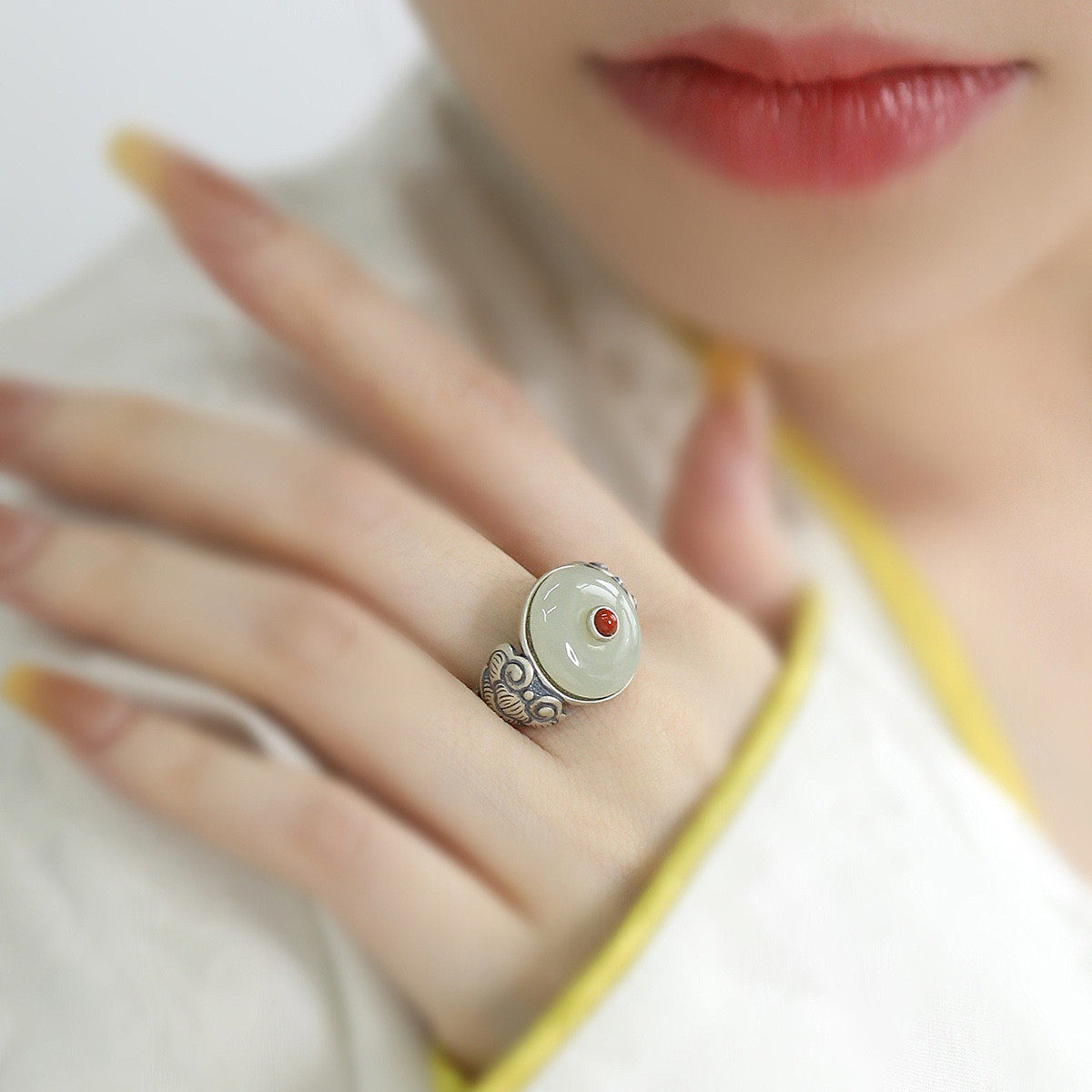 925银和田玉平安扣南红玛瑙戒指女复古百搭民族风小众设计指环