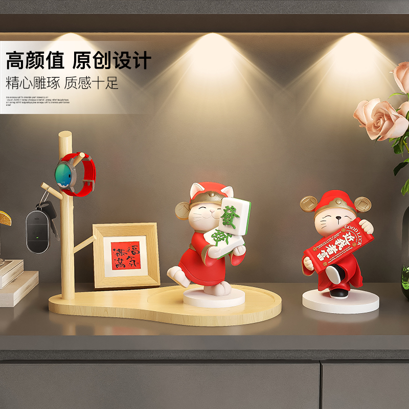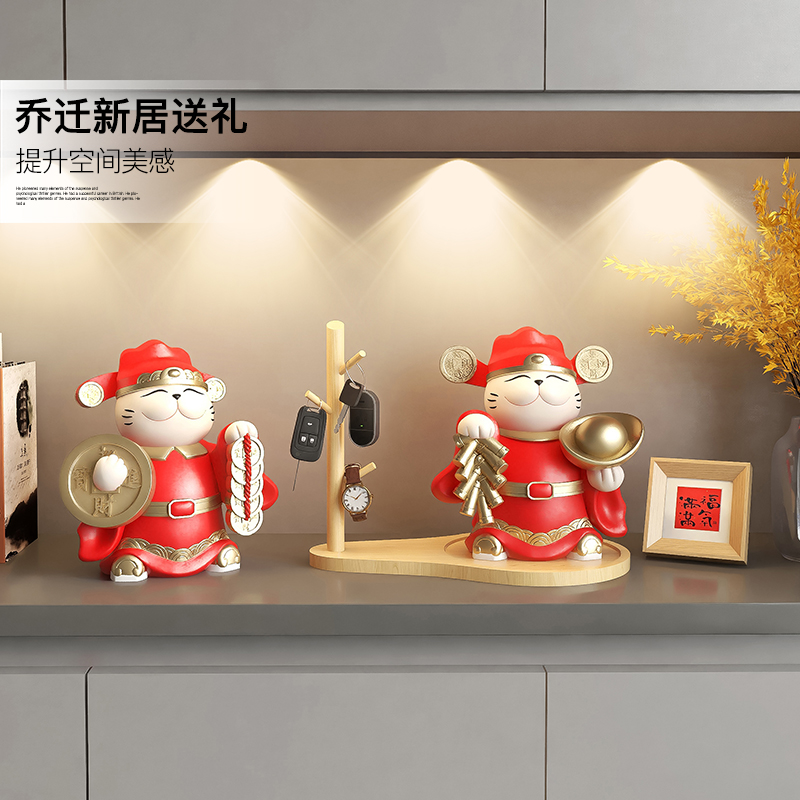 红色装饰品招财猫摆件玄关钥匙收纳组合高级感小众开业乔迁礼物