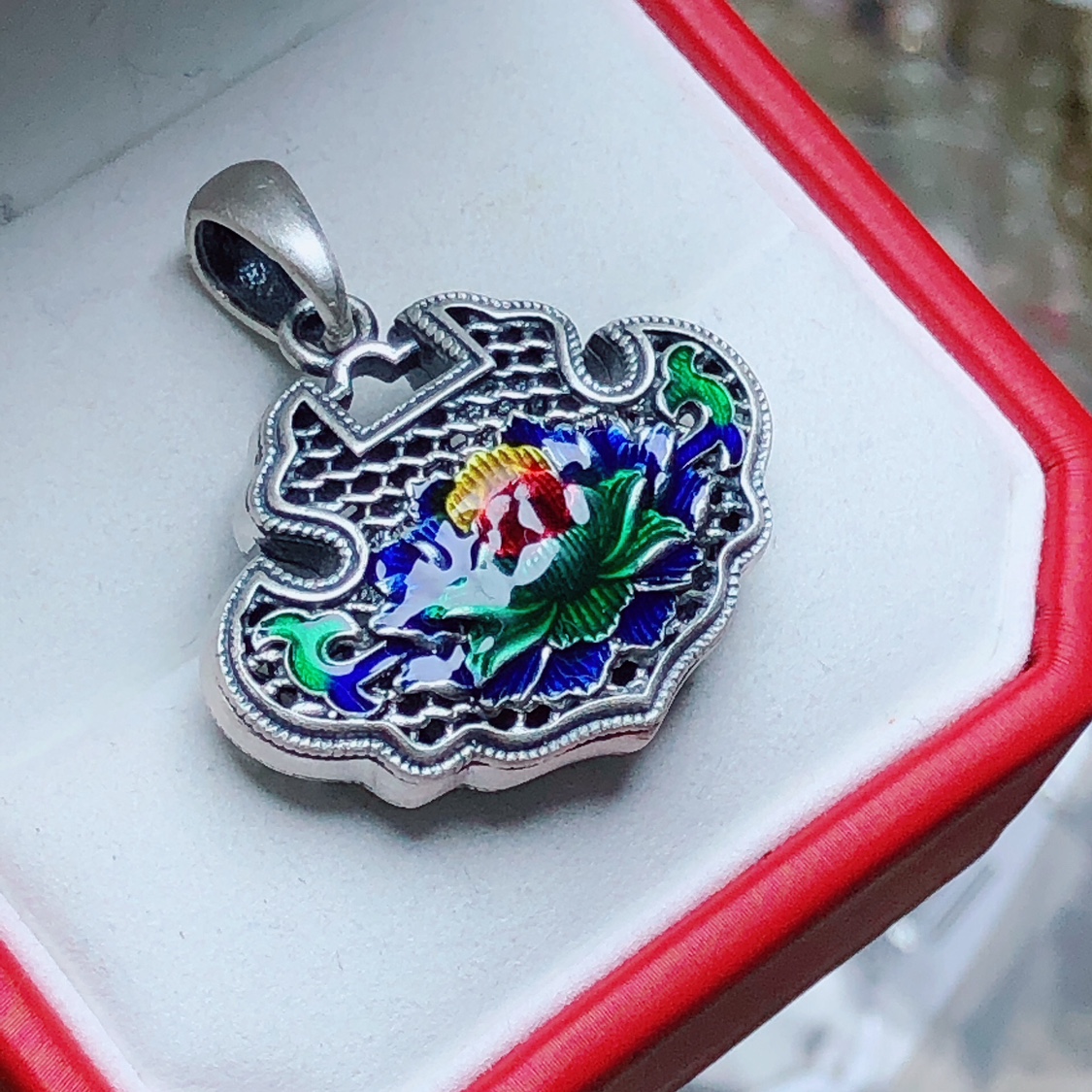 足银999牡丹花锁吊坠景泰蓝双面雕挂坠流行吊坠富贵连绵纯银饰品