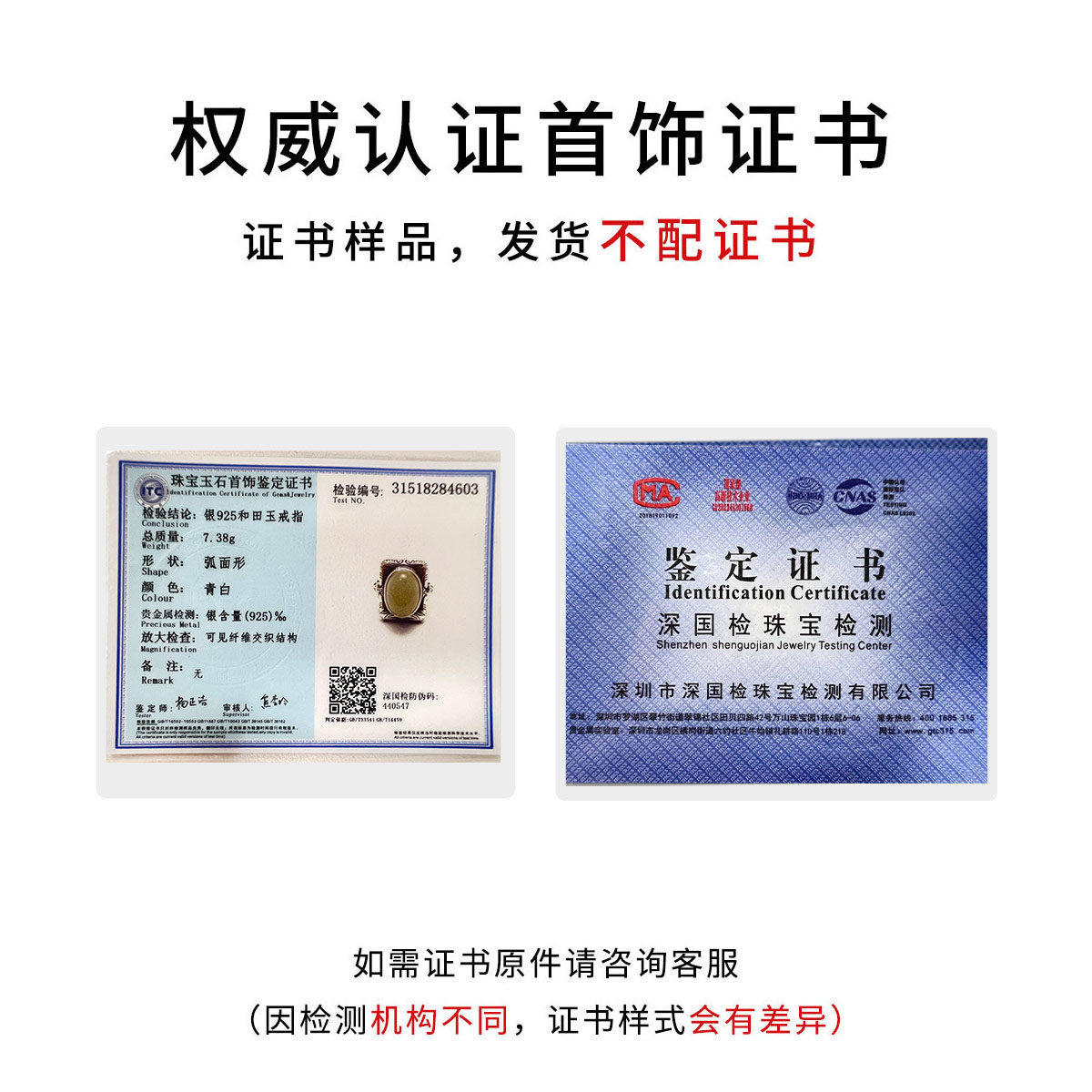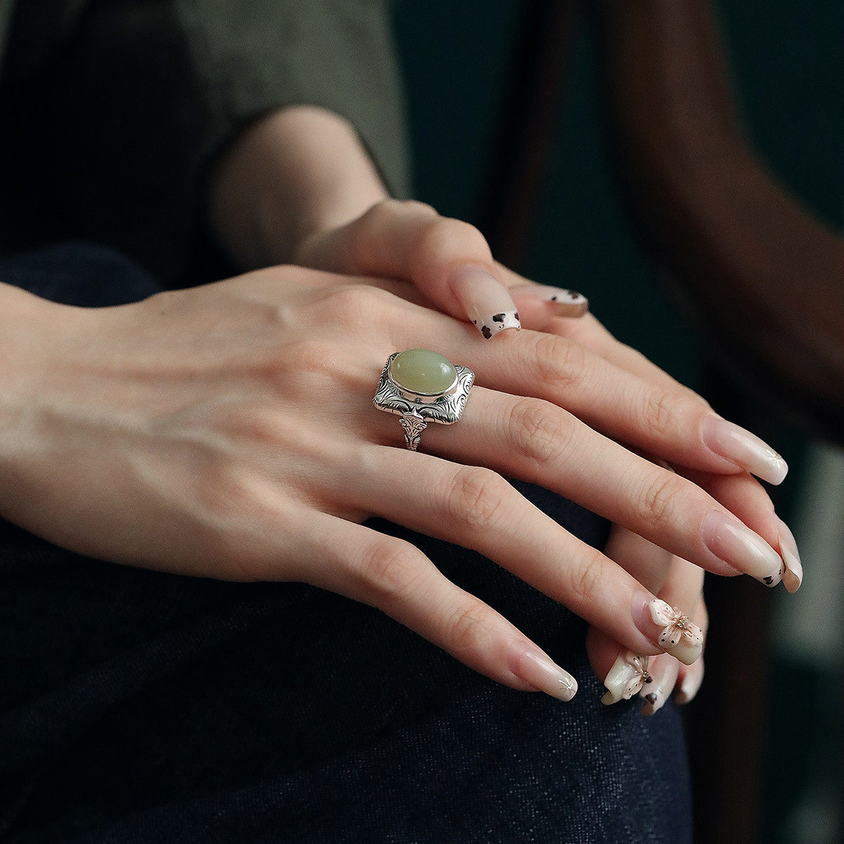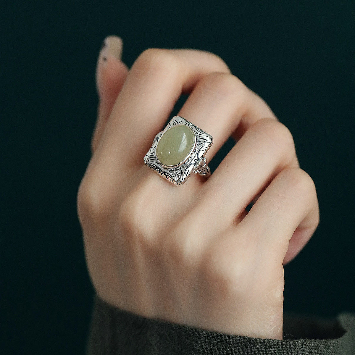 925银蛋面和田玉方形戒指女国风小众设计新中式可调节指环饰品