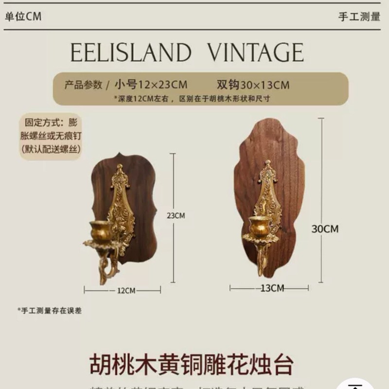 原创新款胡桃木复古中古黄铜壁挂烛台装饰挂件