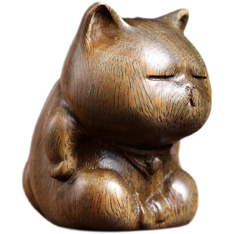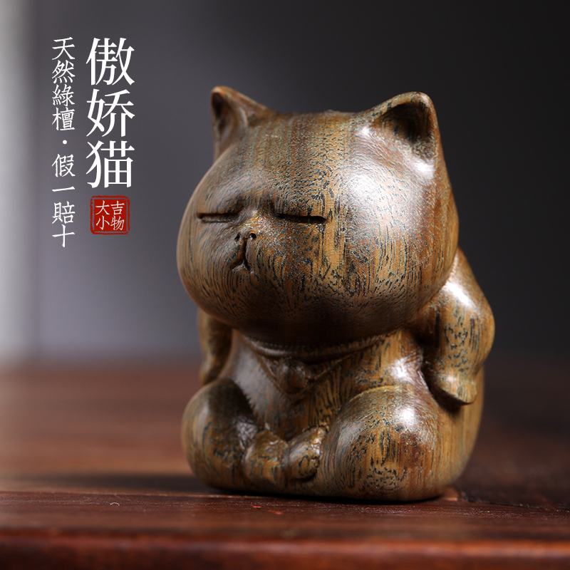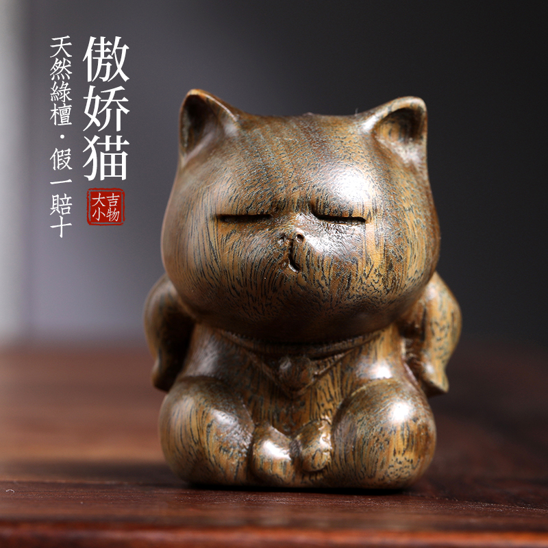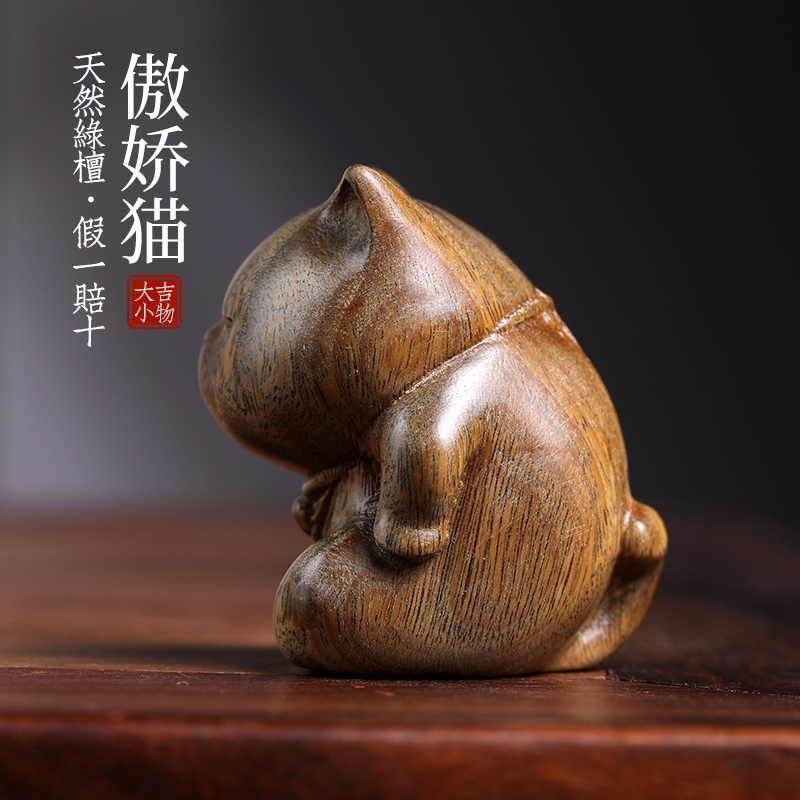 天然紫檀绿檀木可爱猫木雕手把件招财猫不生气摆件桌面书桌小摆件