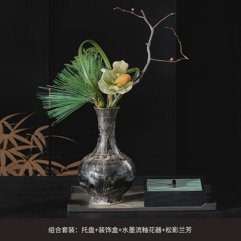 新中式古典陶瓷大花瓶高级感摆件装饰插花托盘客厅盒软装搭配设计