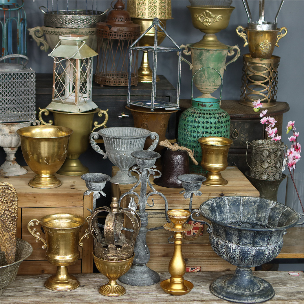 孤品大集合-外贸复古原单家居饰品复古做旧铁艺奖杯花盆烛台摆件