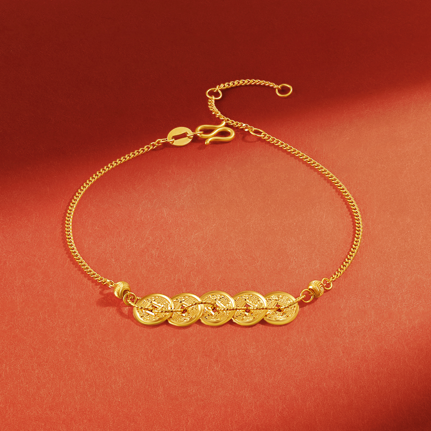 周六福5G黄金计价足金钱多多碎碎冰五帝铜钱女款链坠手链圣诞礼物