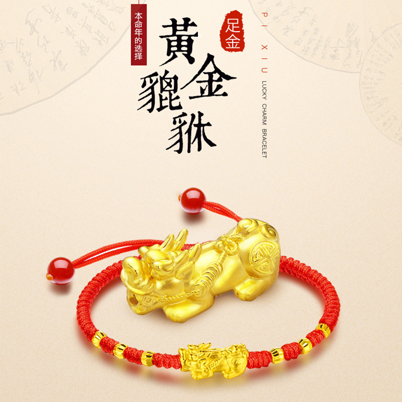 貔貅手链黄金转运珠999足金3D硬金皮丘招财红绳手链男女情侣七夕