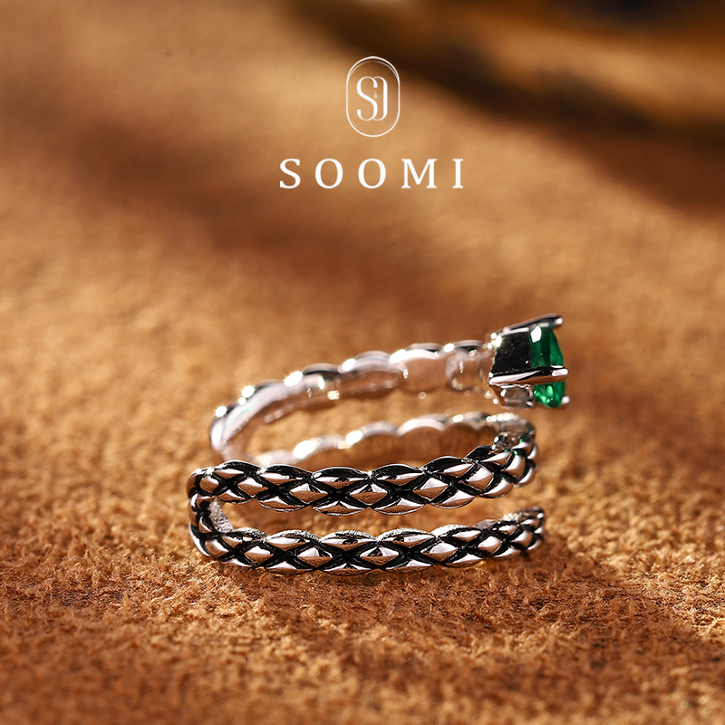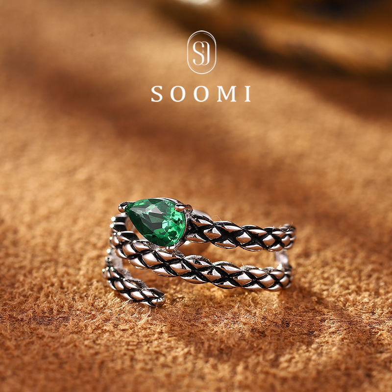 【SOOMI 青蛇】925银0.5ct培育祖母绿宝石戒指简约设计戒环尾戒女