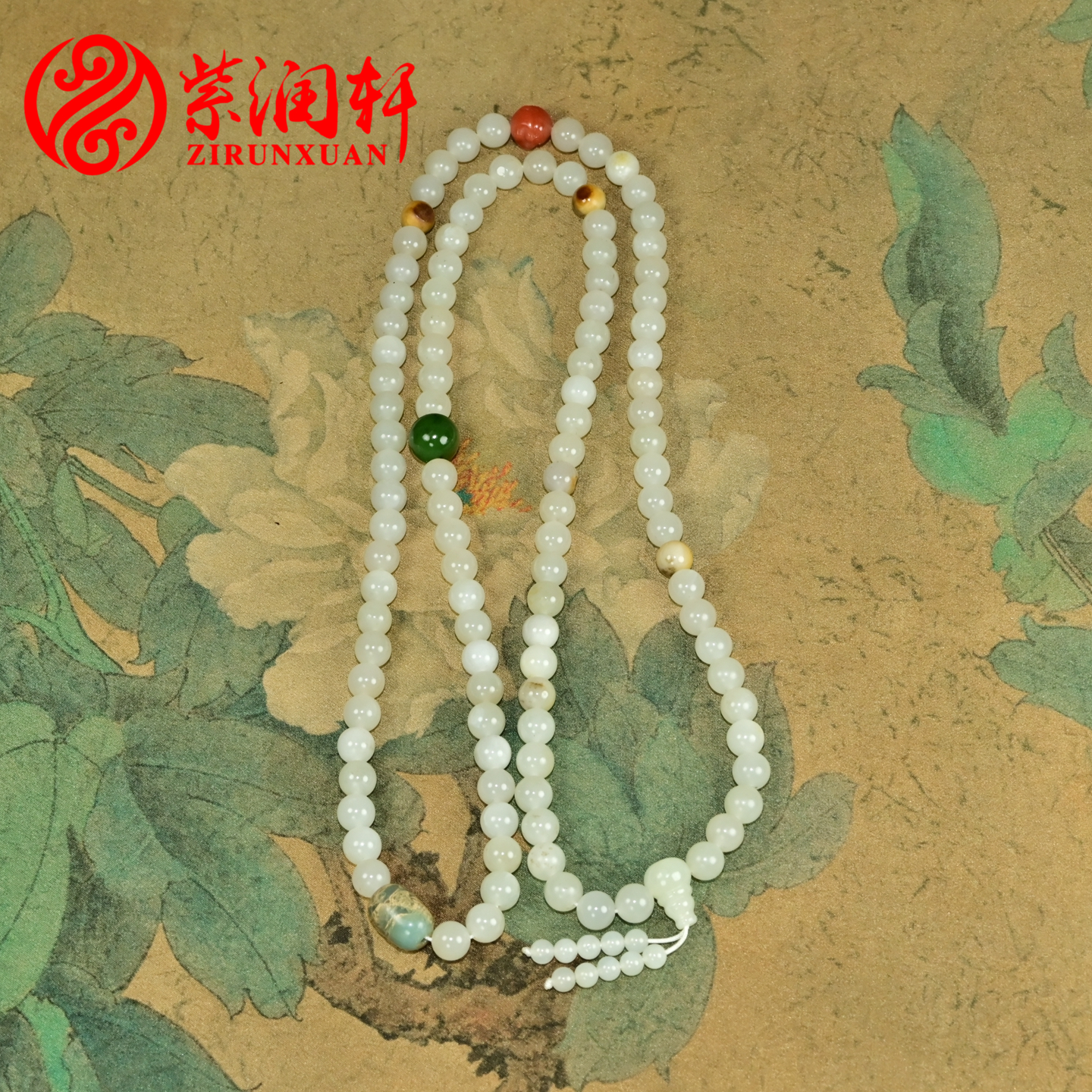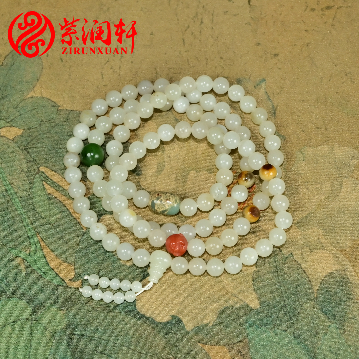 紫润轩新疆和田玉108籽料白玉圆佛珠项链黄沁皮籽料8mm手链收藏级