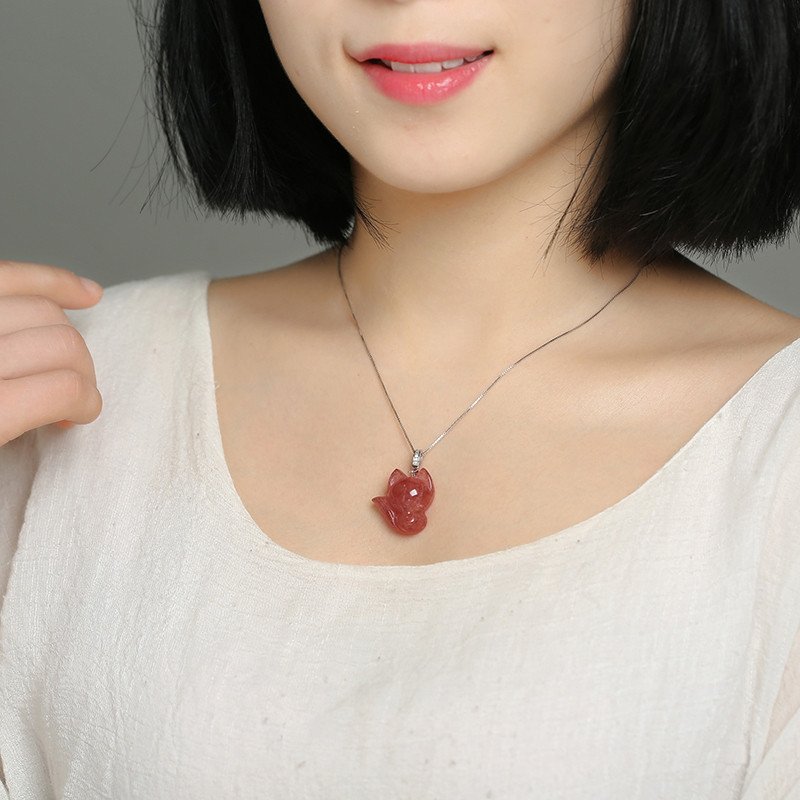 天然草莓晶狐狸吊坠女款招桃花粉水晶项链锁骨链好运闺蜜礼物正品