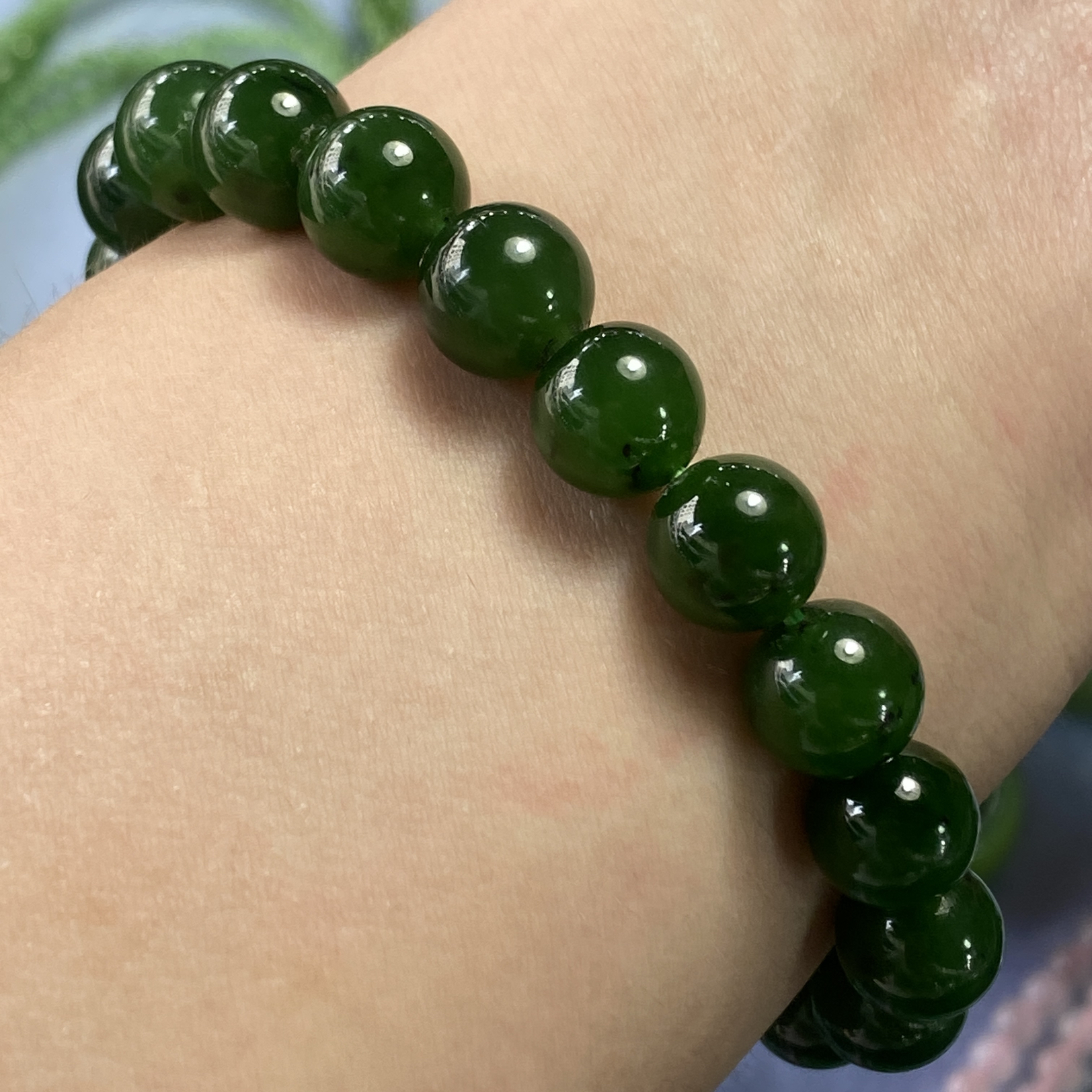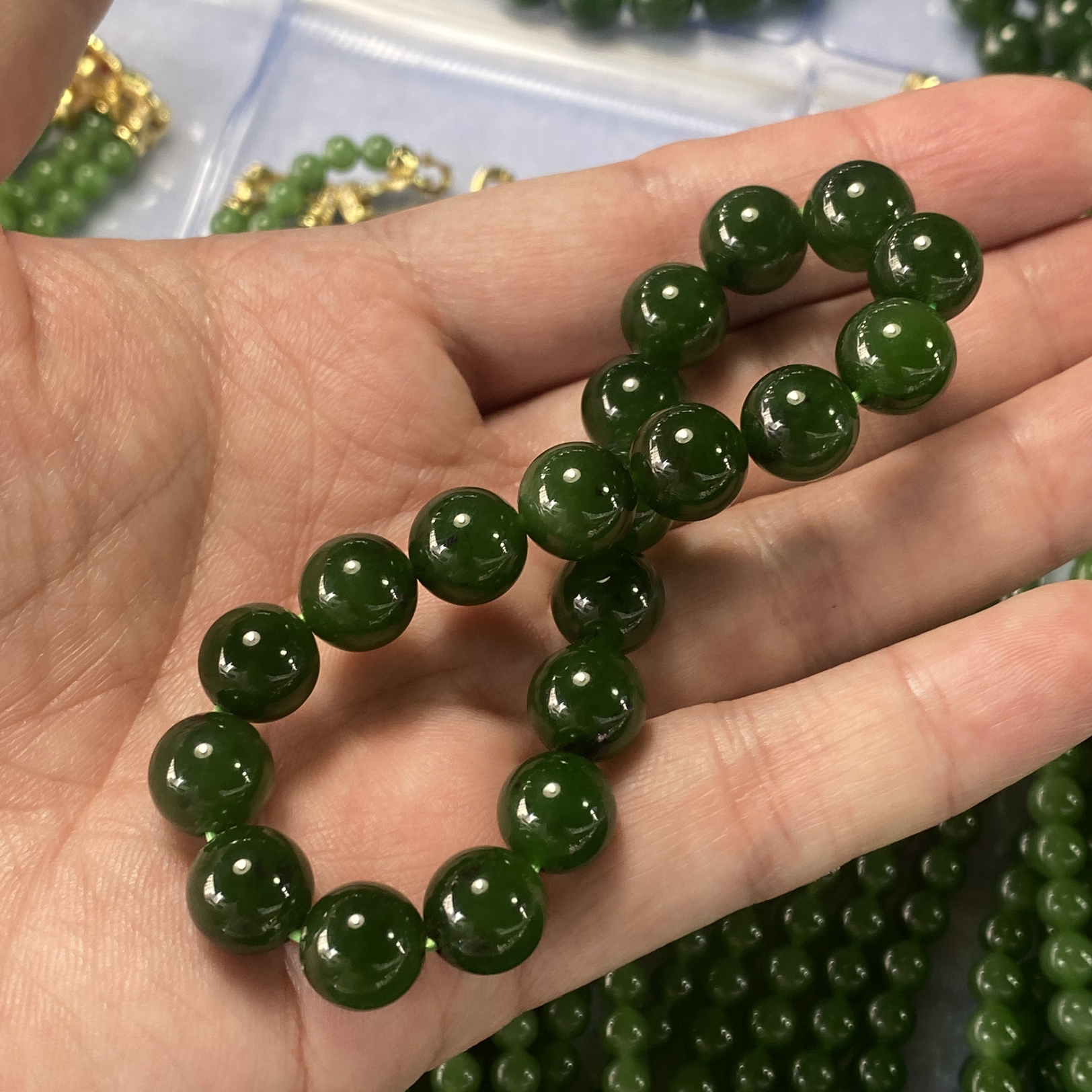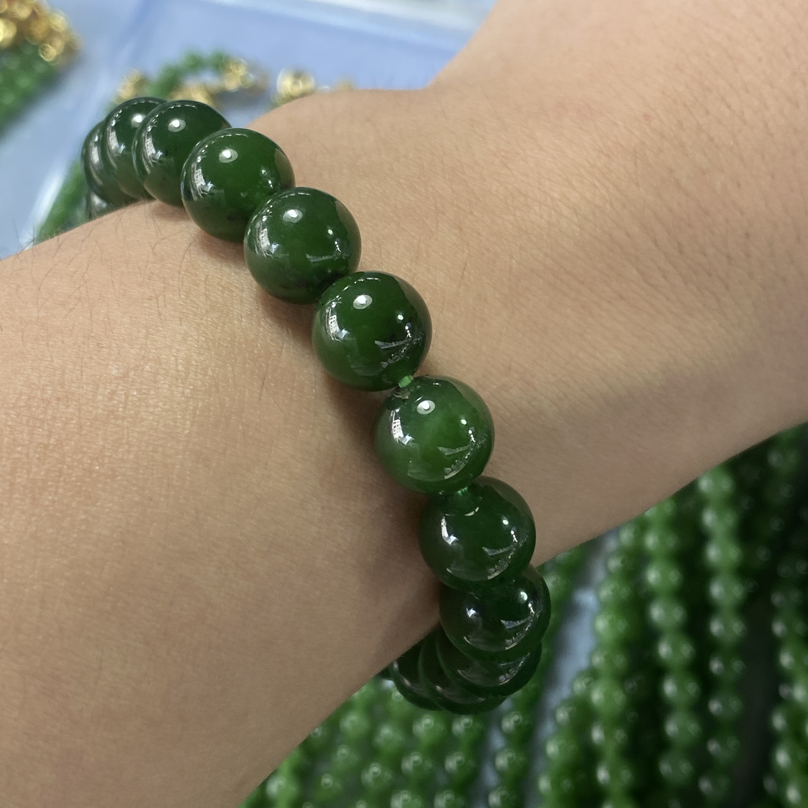 天然玉石新疆和田玉俄罗斯碧玉菠菜绿圆珠手链9.5mm男女款精美串