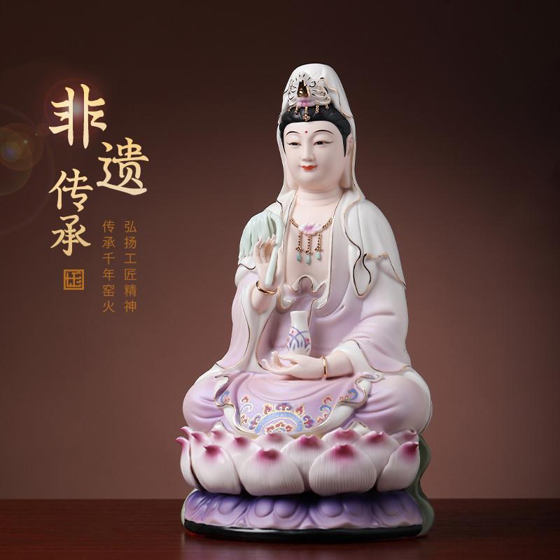 陶瓷坐莲南海观音菩萨佛像摆件彩绘观世音菩萨像客厅家用供奉