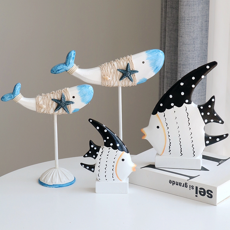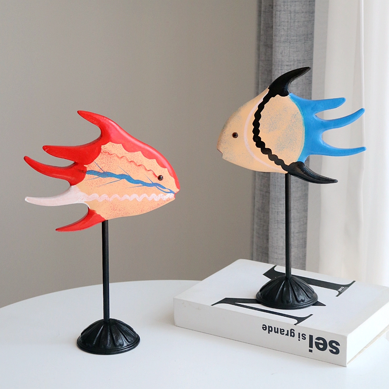 地中海家居饰品蓝白木质对鱼摆件做旧亲嘴鱼桌面电视机柜精致摆设